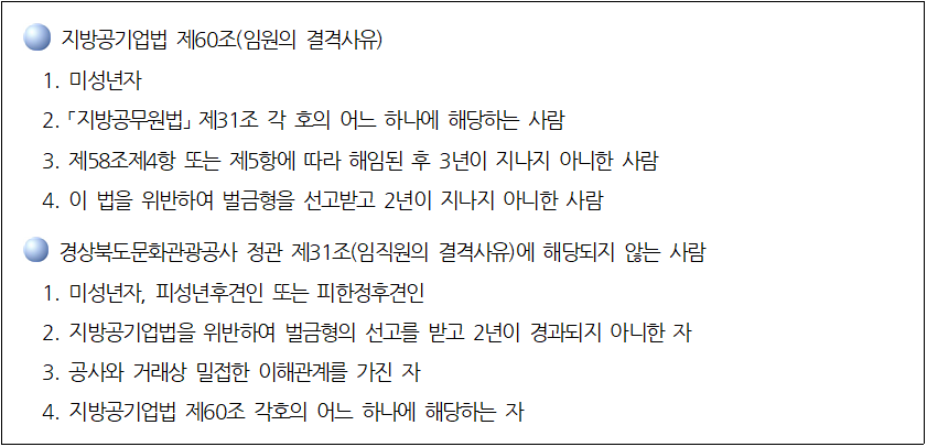 응시자는 지방공기업법 제60조 "임원의 결격사유" 및 정관 제31조 "임직원의 결격사유"에 해당되지 않아야 한다.