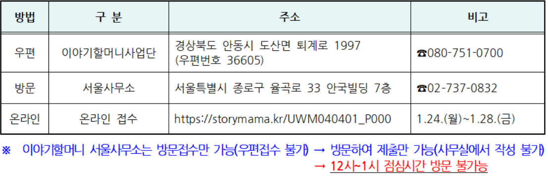 ※이야기할머니 서울사업소는 방문접수만 가능합니다.(우편접수 불가하고 12:00 ~ 13:00는 점심시간)