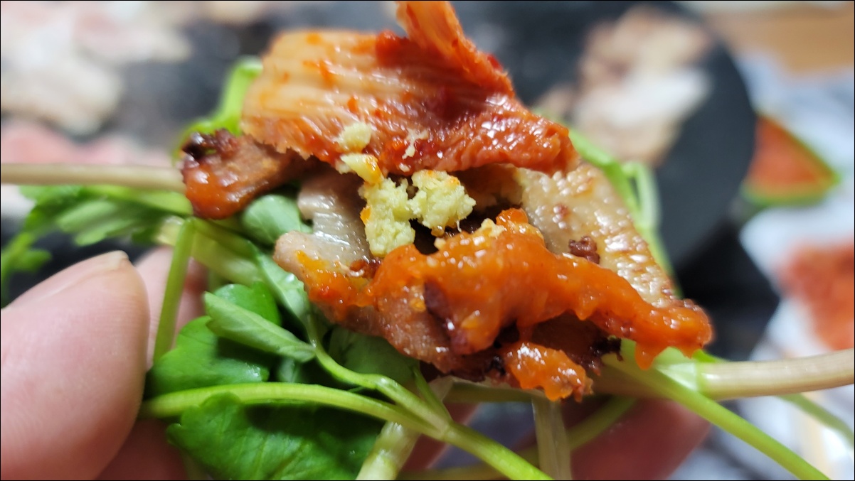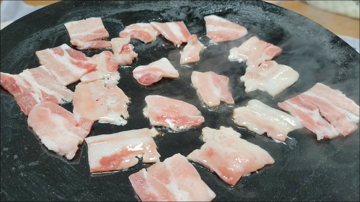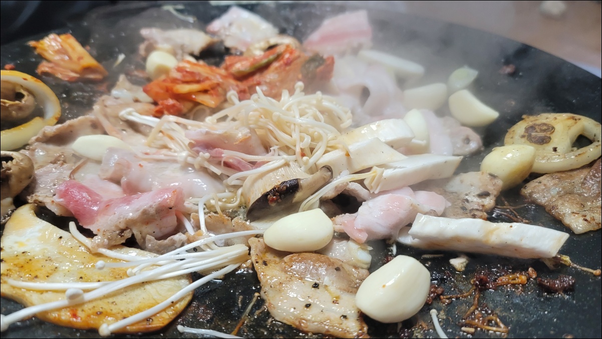 그리고 마지막으로 남은 삼겹살, 김치, 버섯을 함께