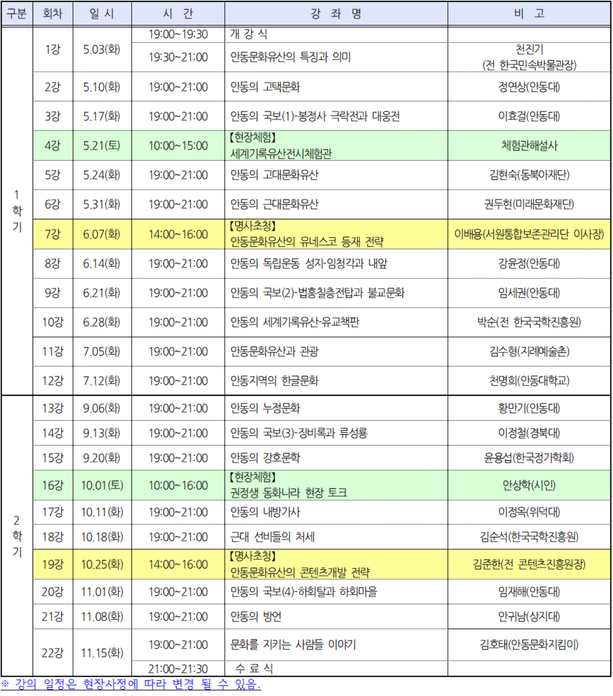매주 화요일마다 총 22회 강의를 진행한다