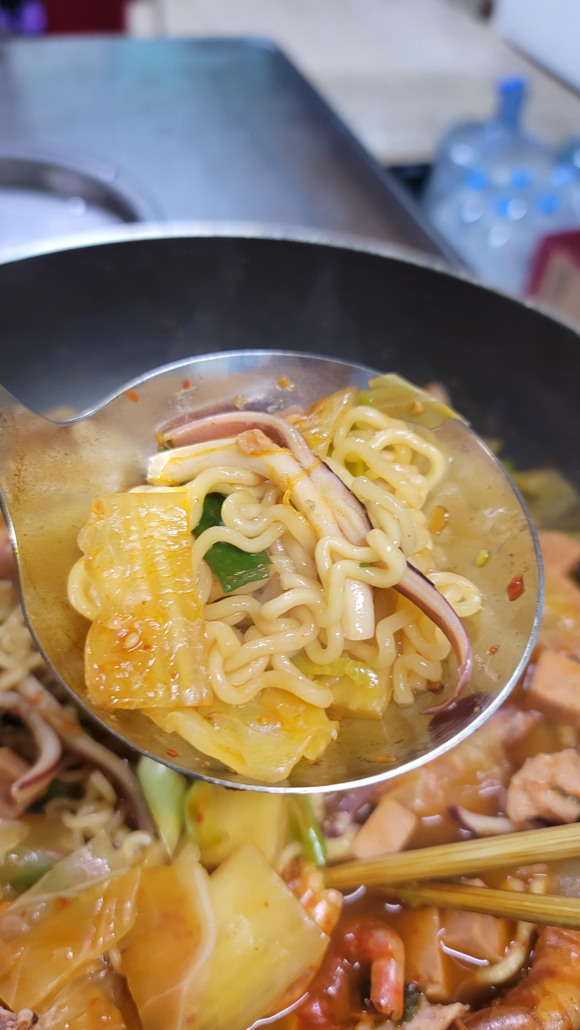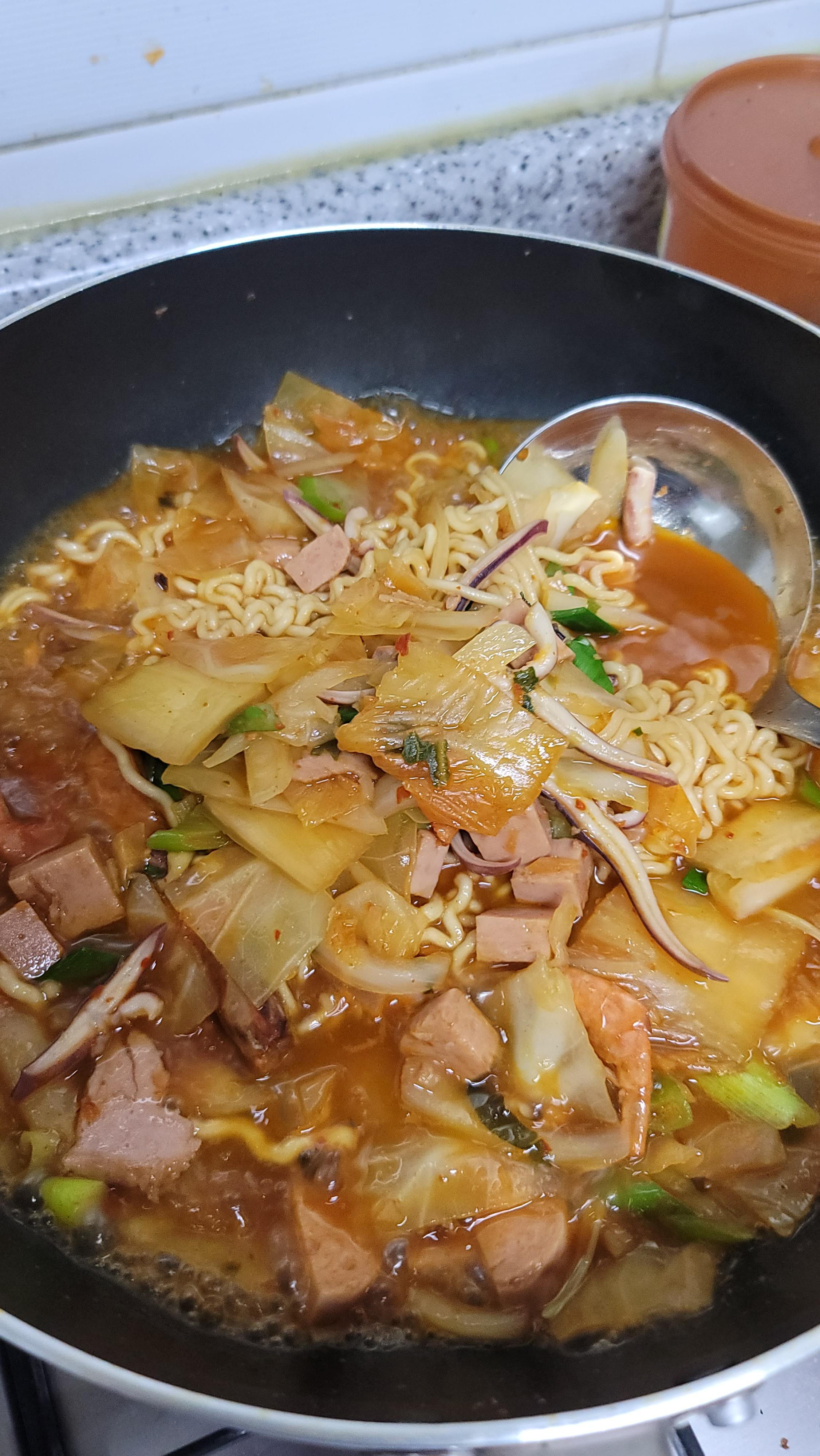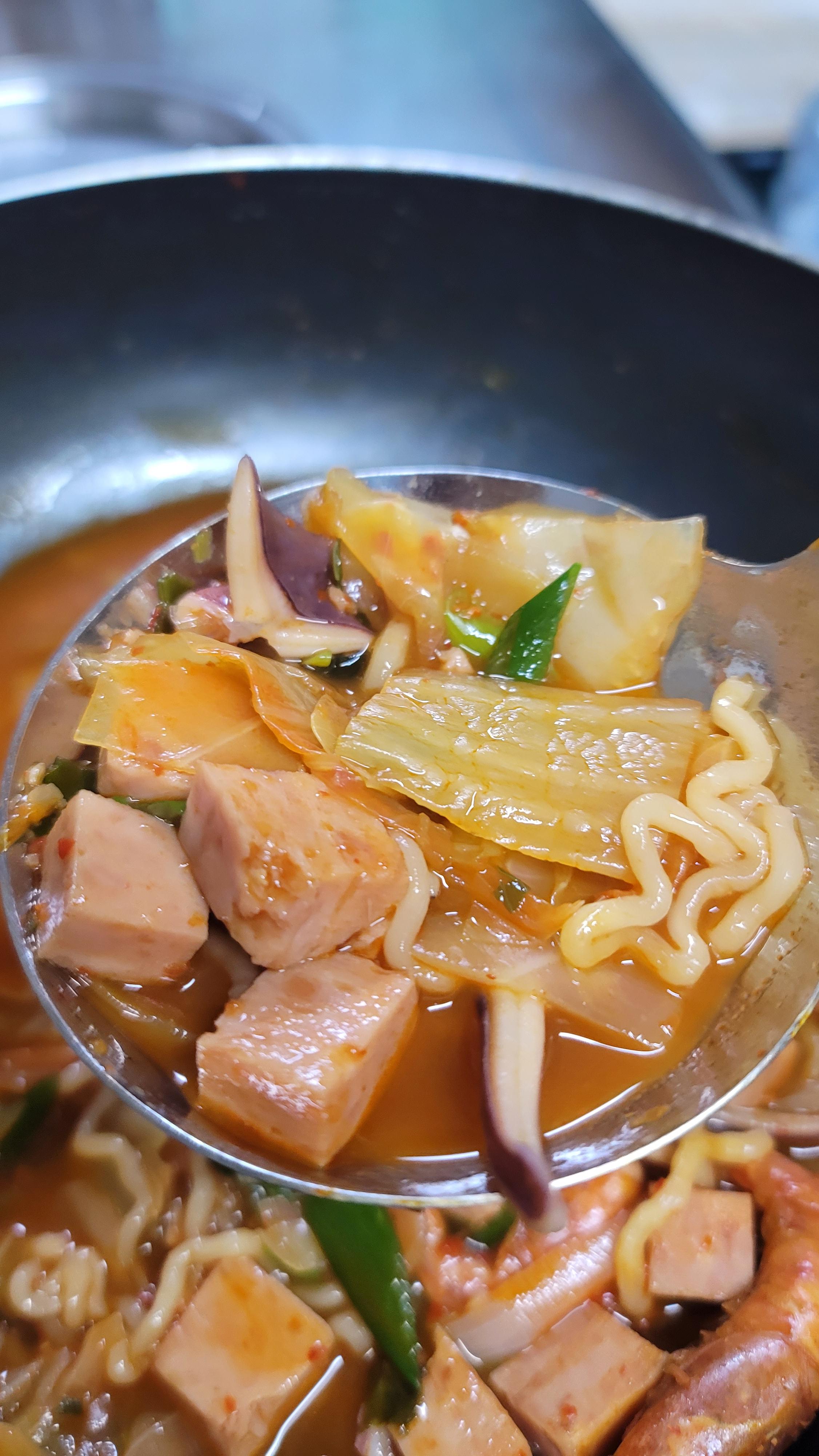 스팸, 오징어, 김치, 양배추 등을 국자로 떠서