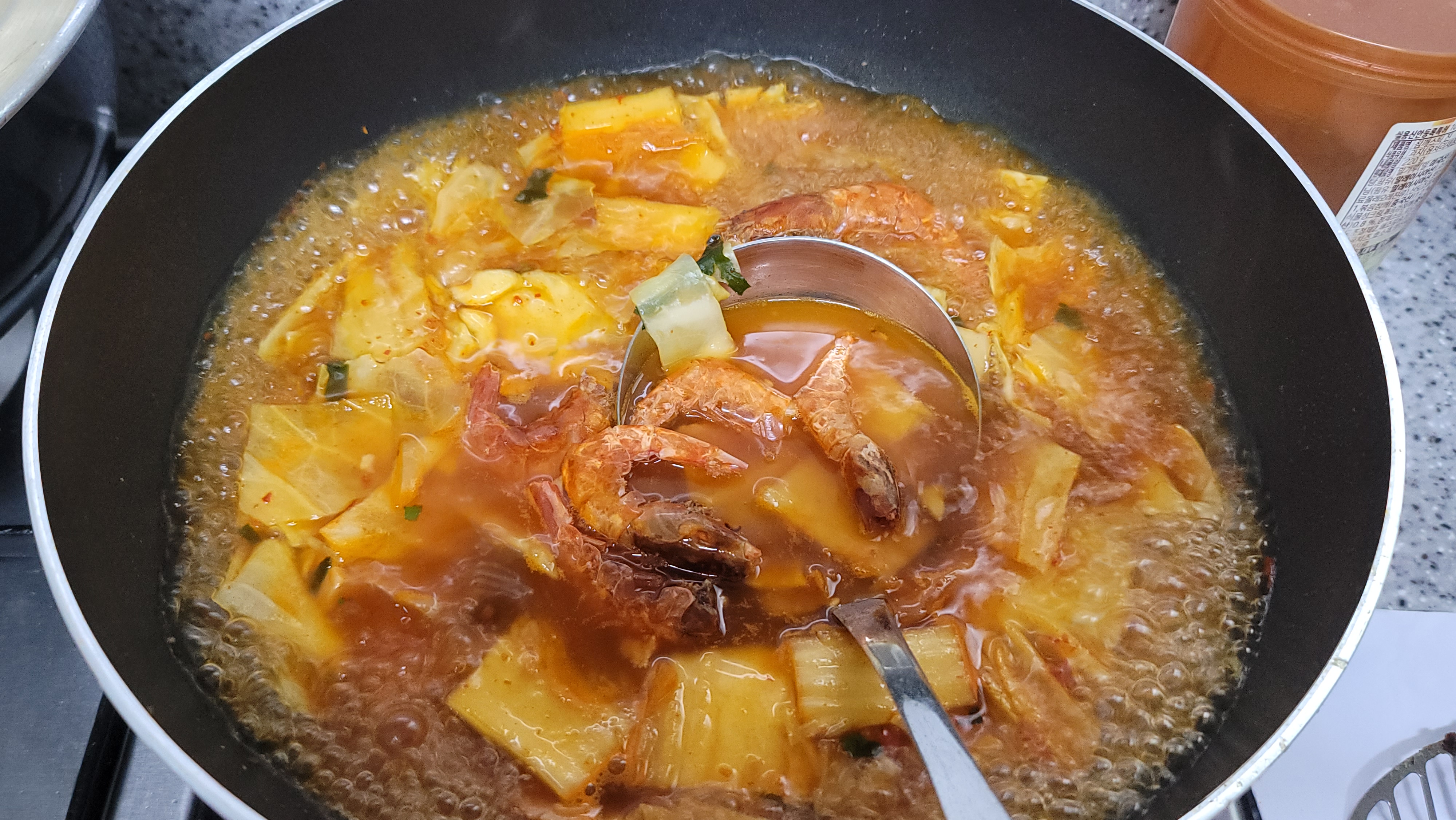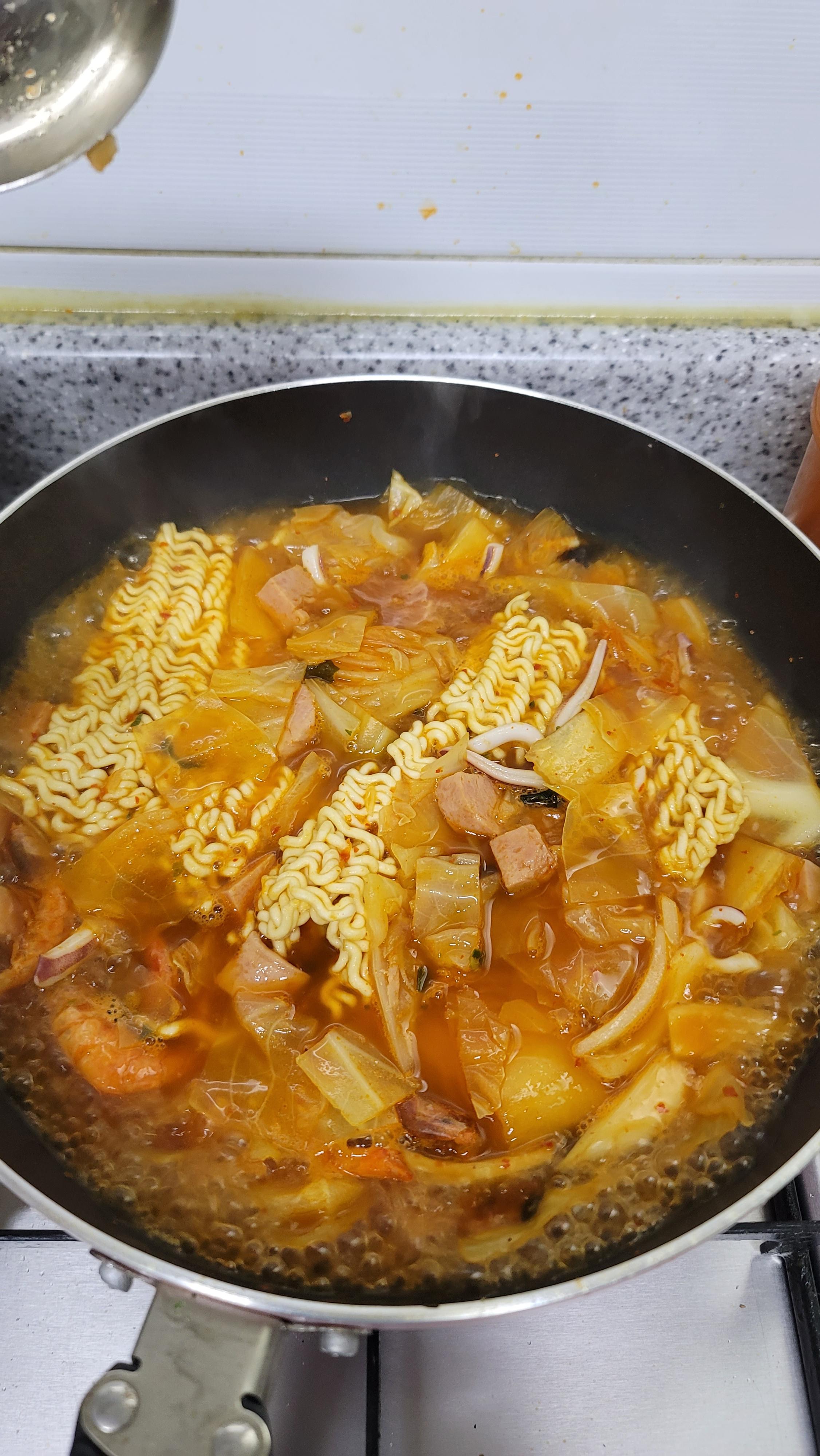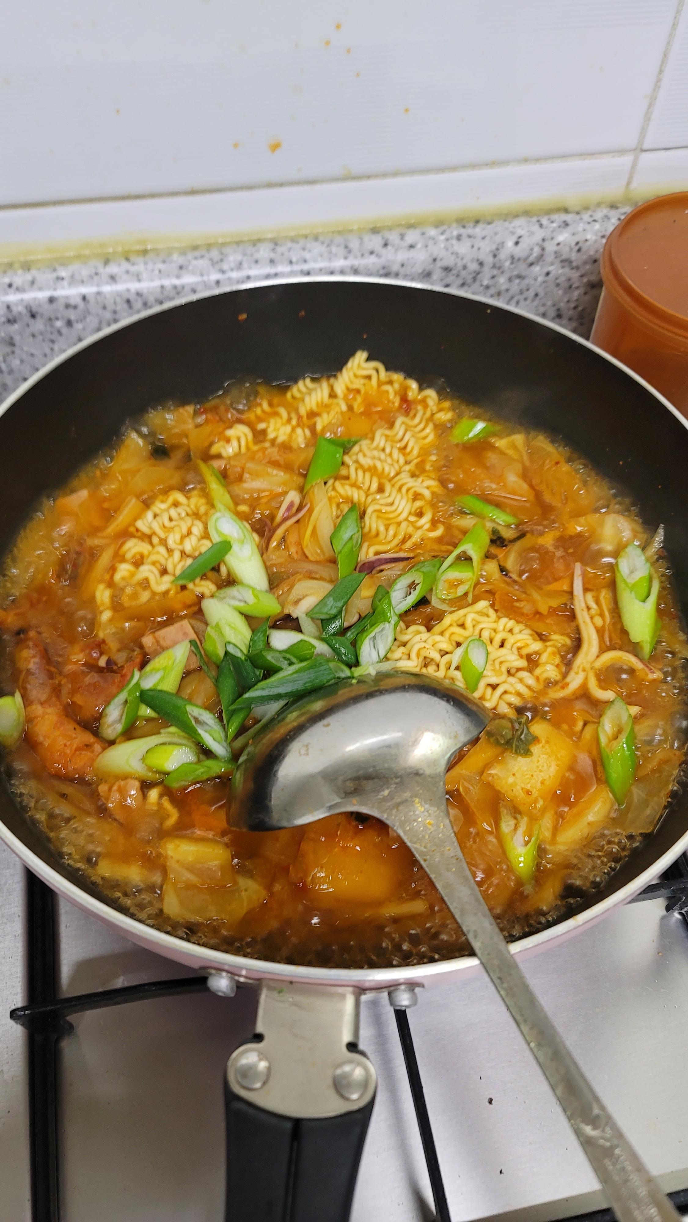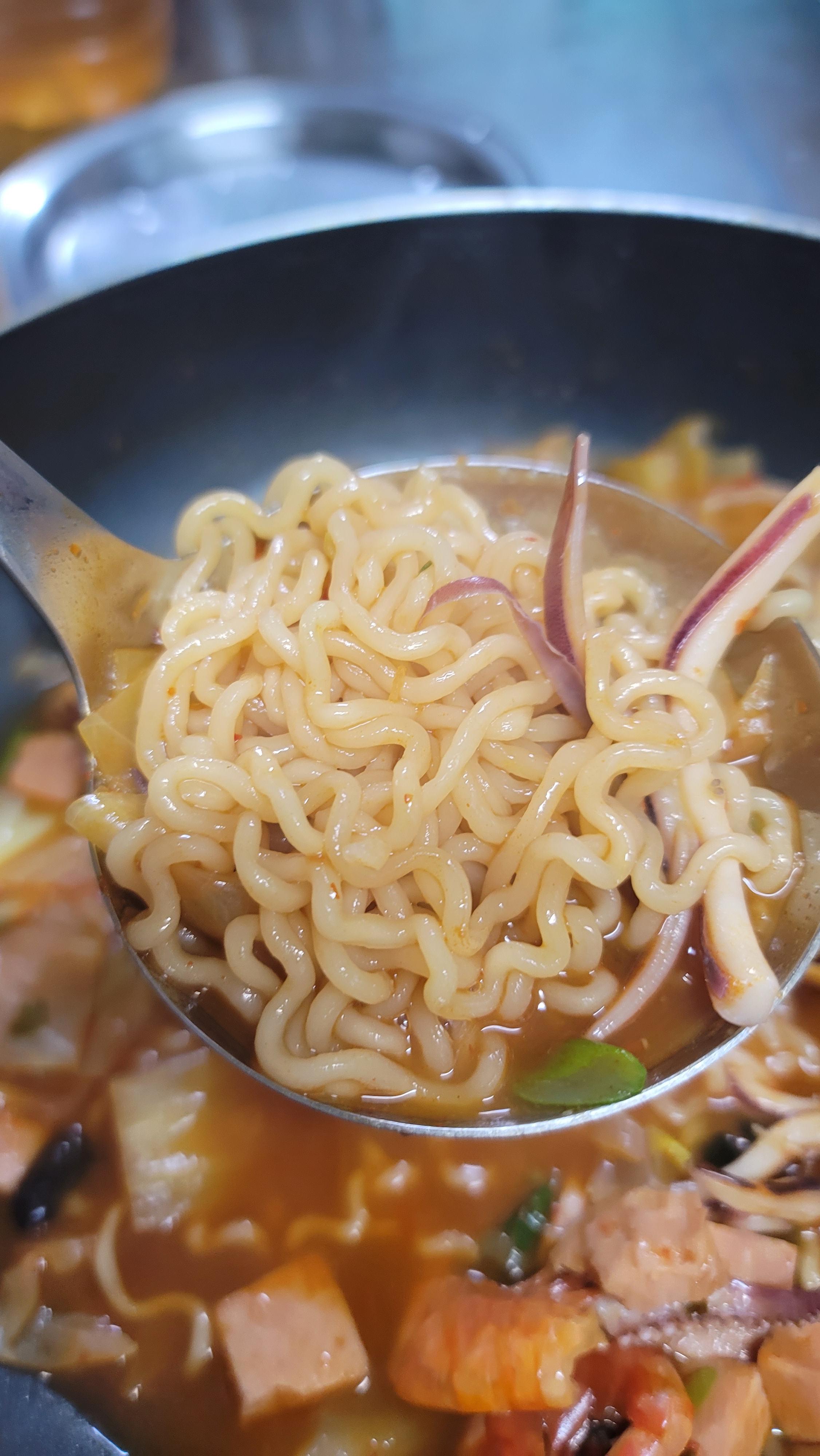 스팸, 오징어, 김치, 양배추 등을 국자로 떠서