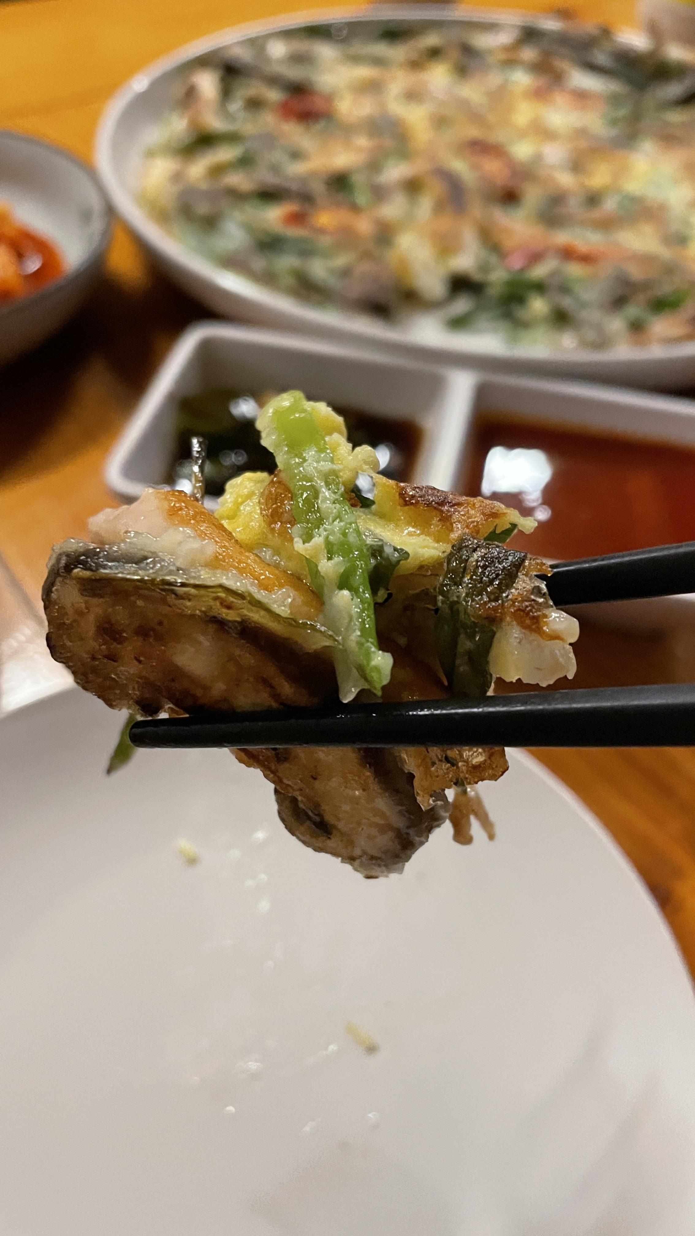 해물이 가득들었다고 해물가득파전이라고 한답니다.