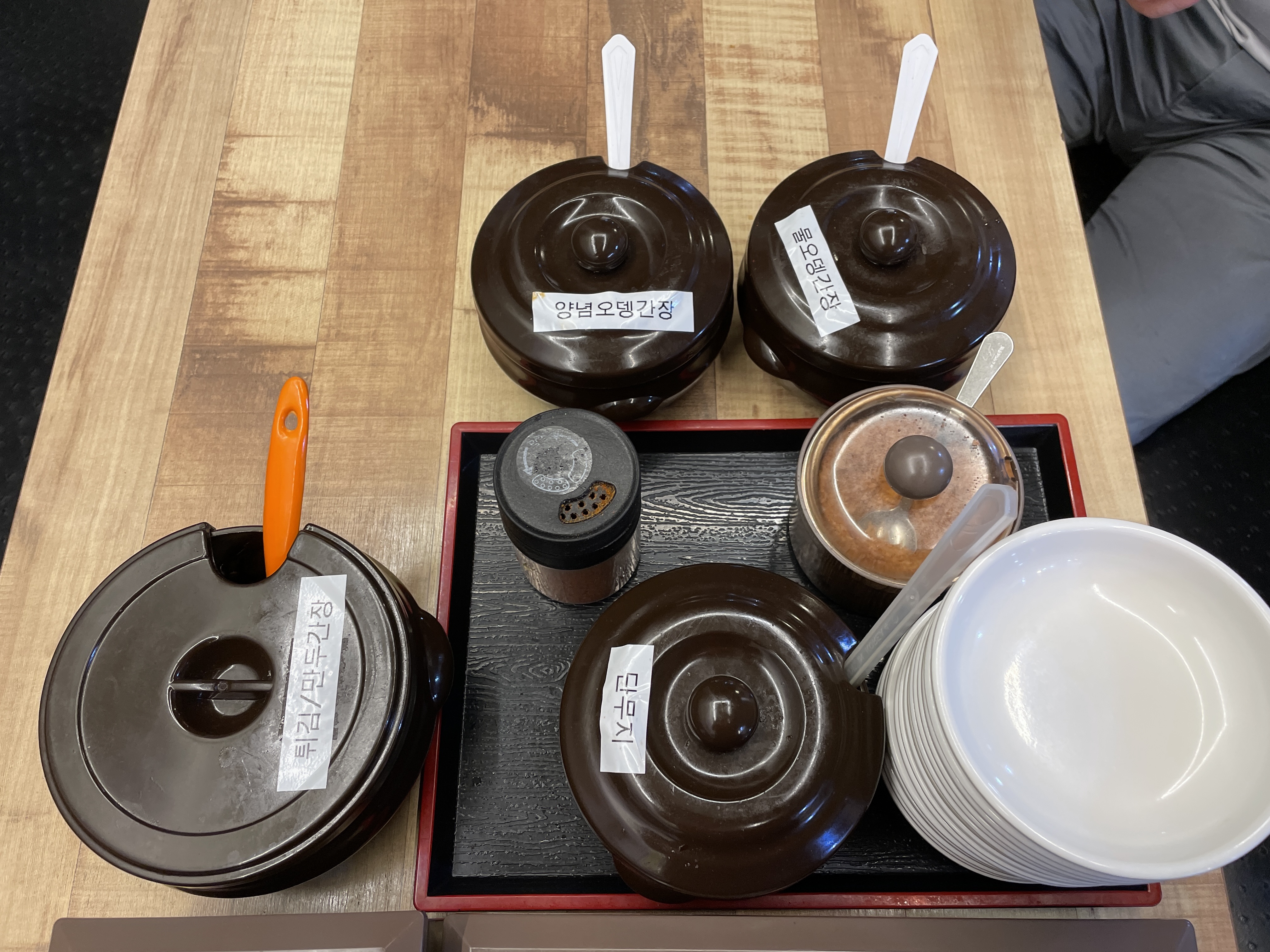 테이블에는 분식과 함께 먹을 소금, 간장, 단무지 등이 모두 마련되어 있다.