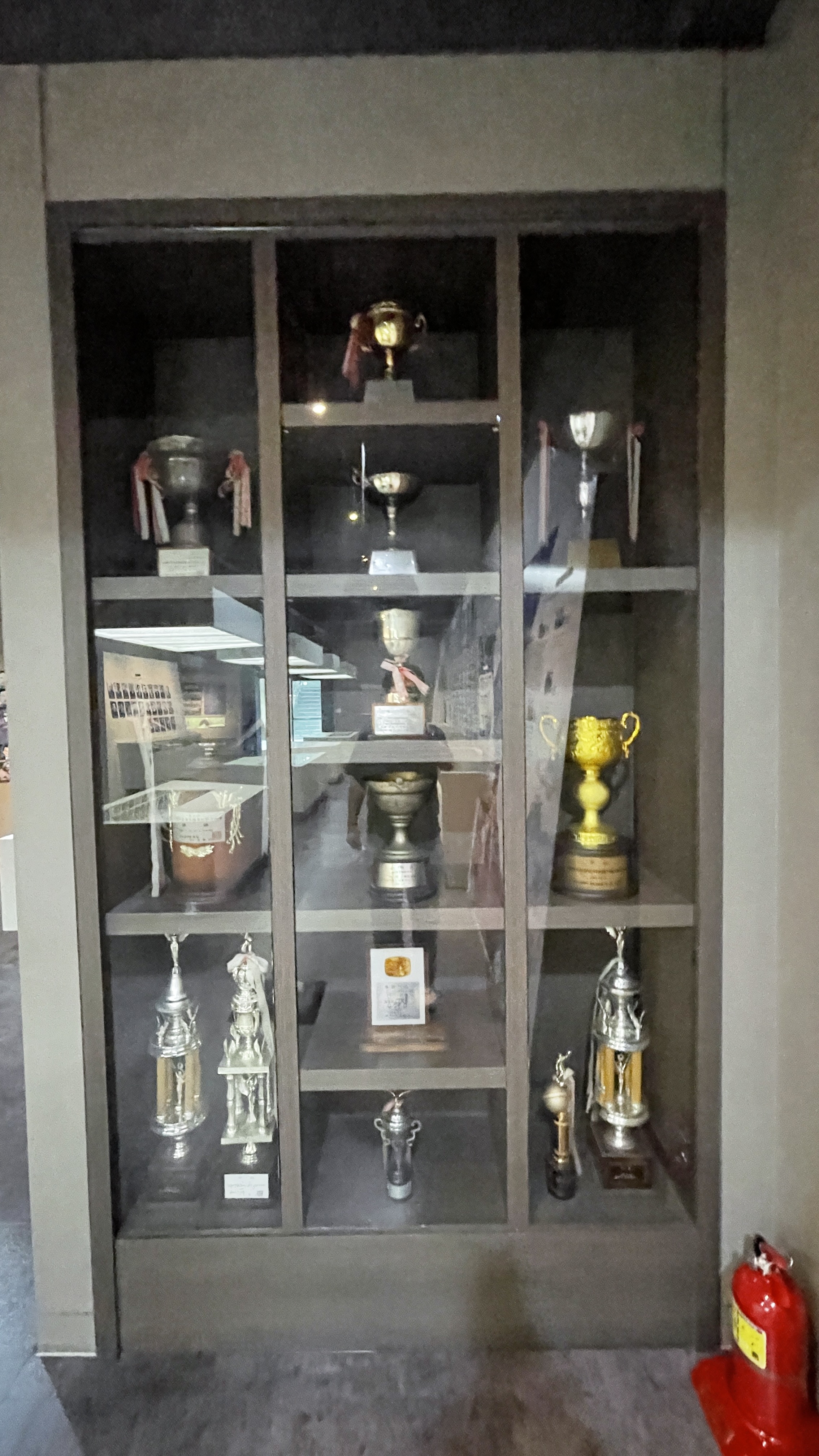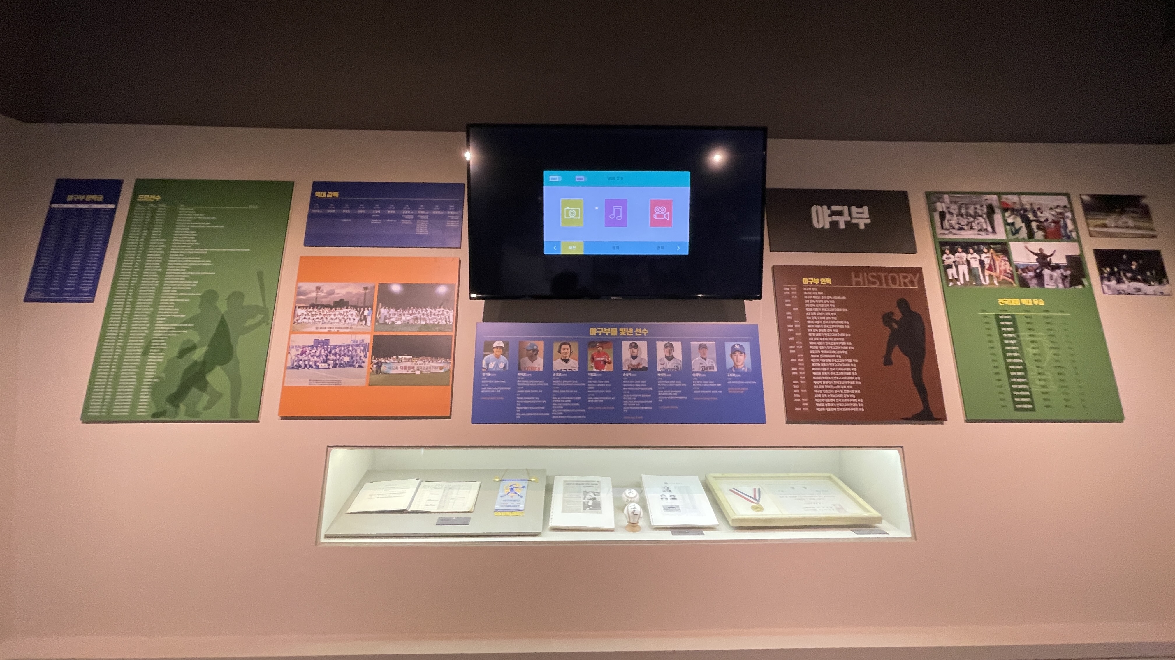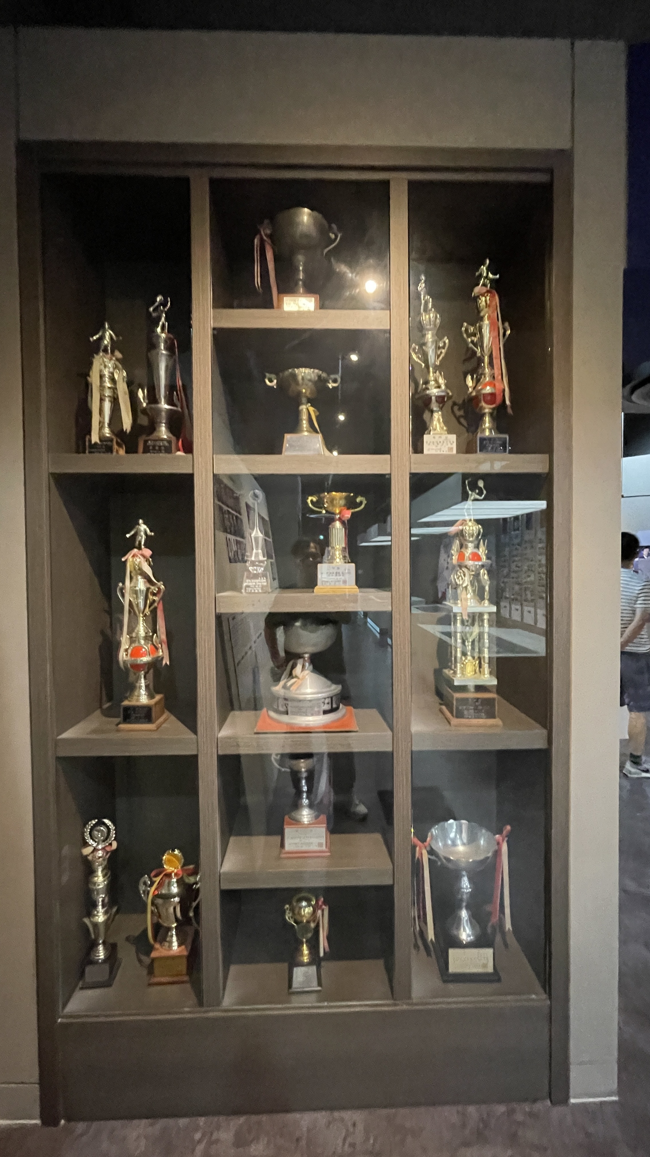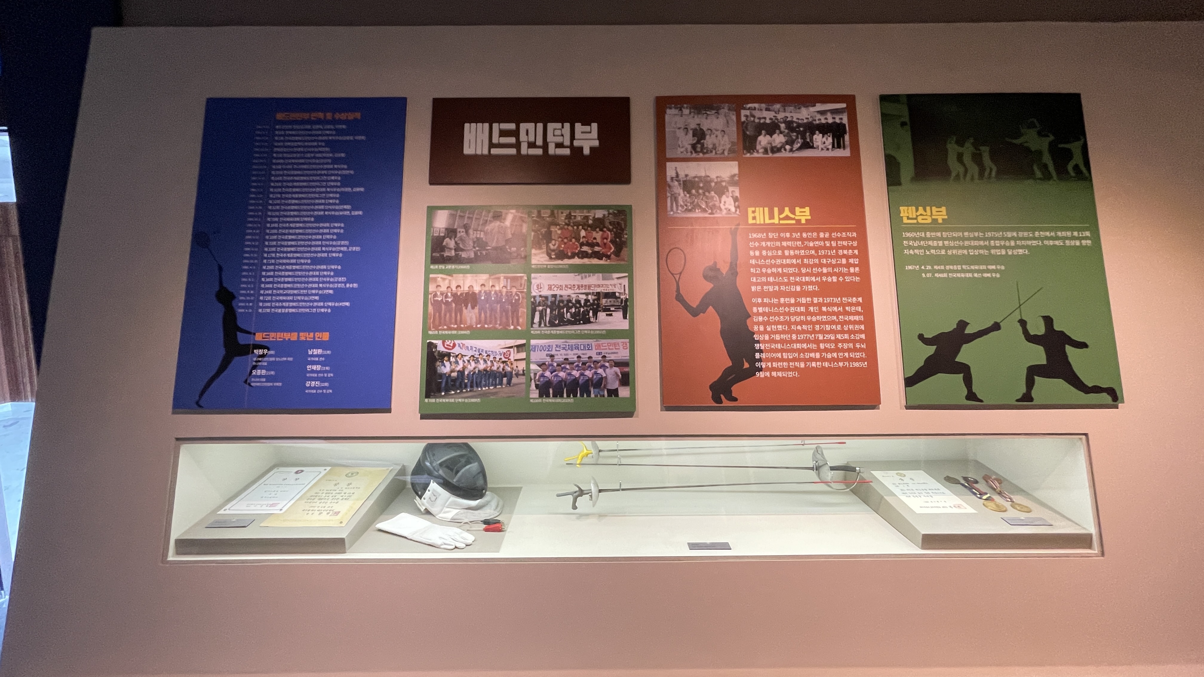 야구, 배드민튼, 펜싱 등에서 획득한 트로피들입니다.