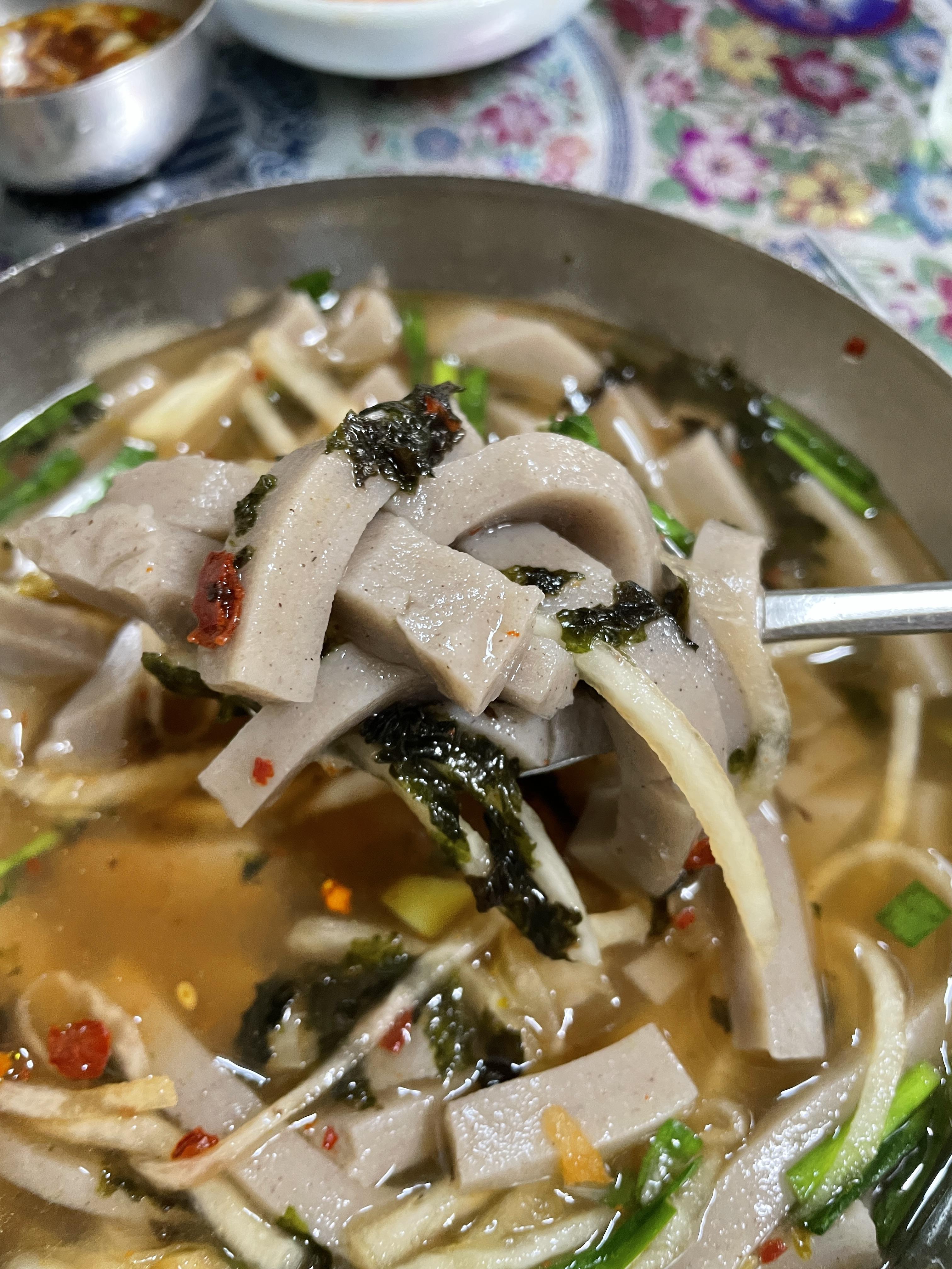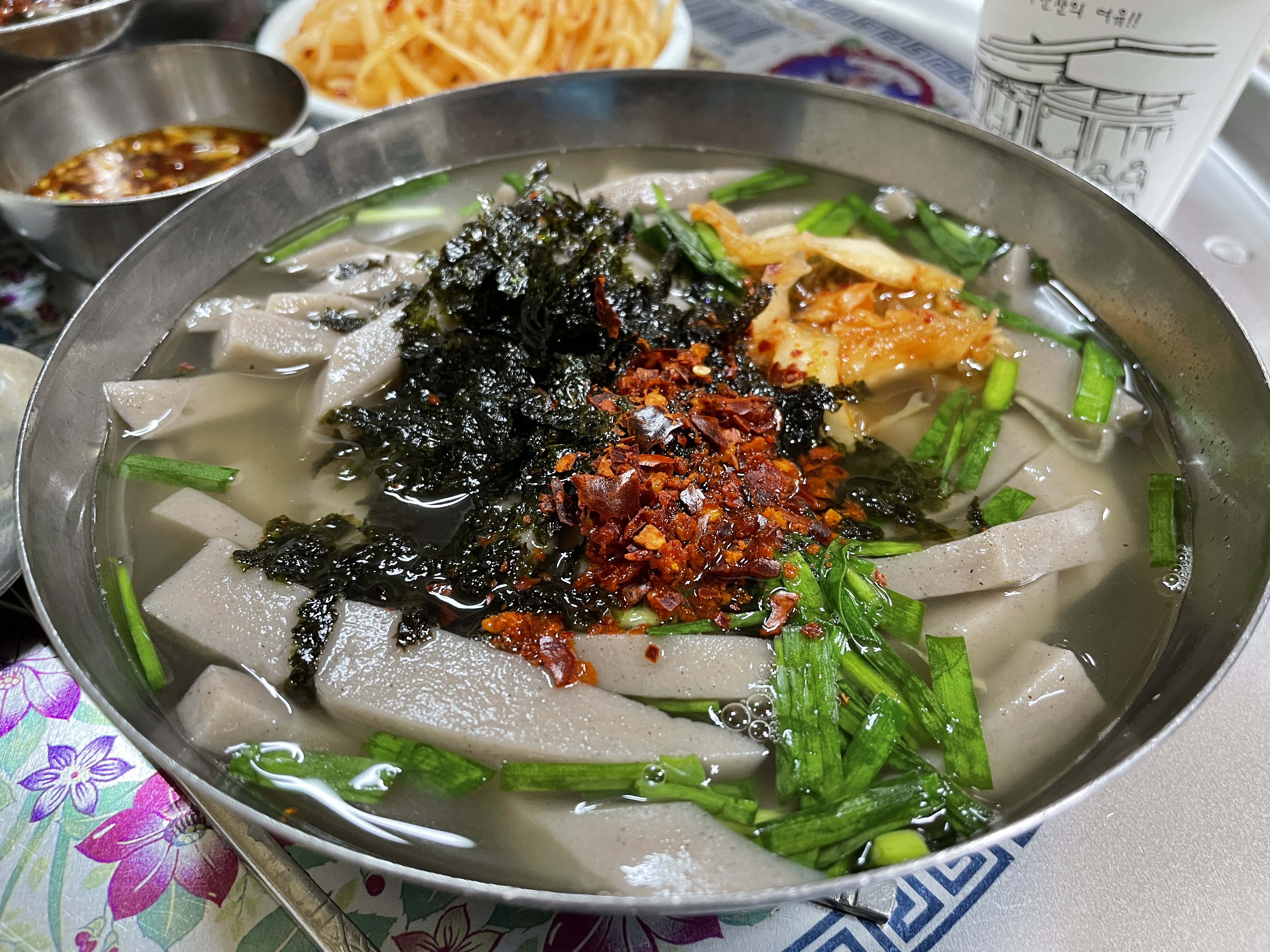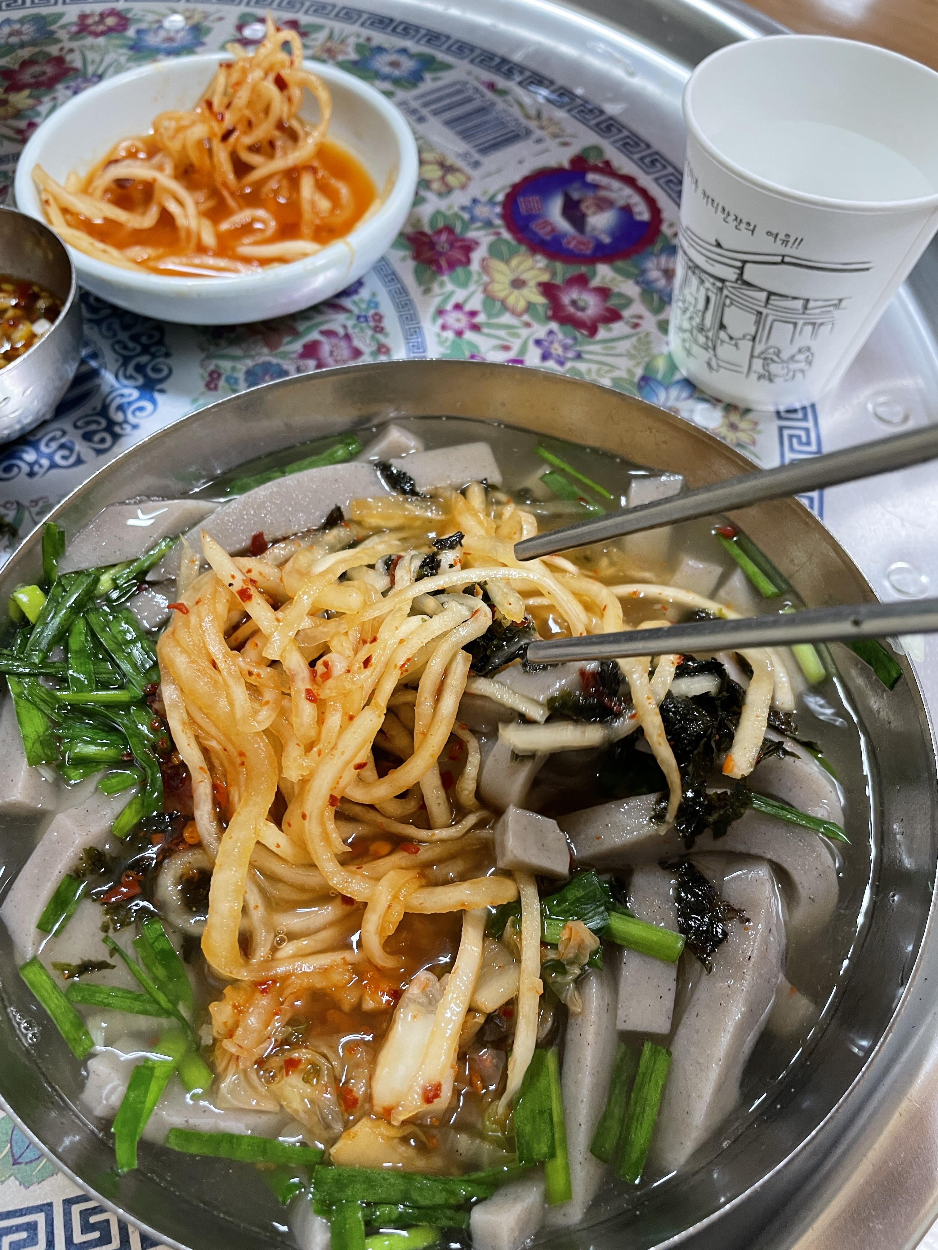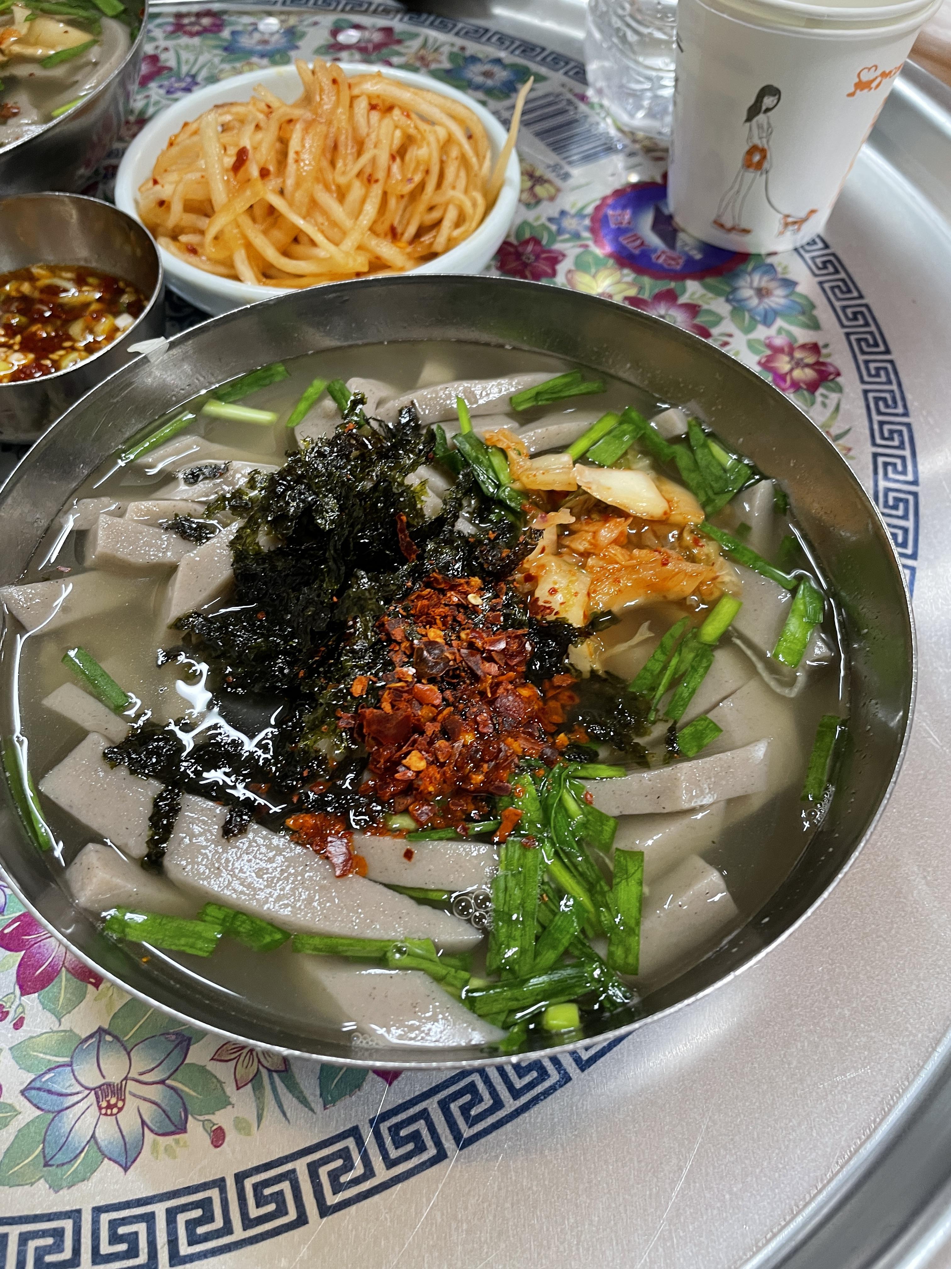 김치, 부추, 김, 고추가루가 올라간 묵 한 그릇