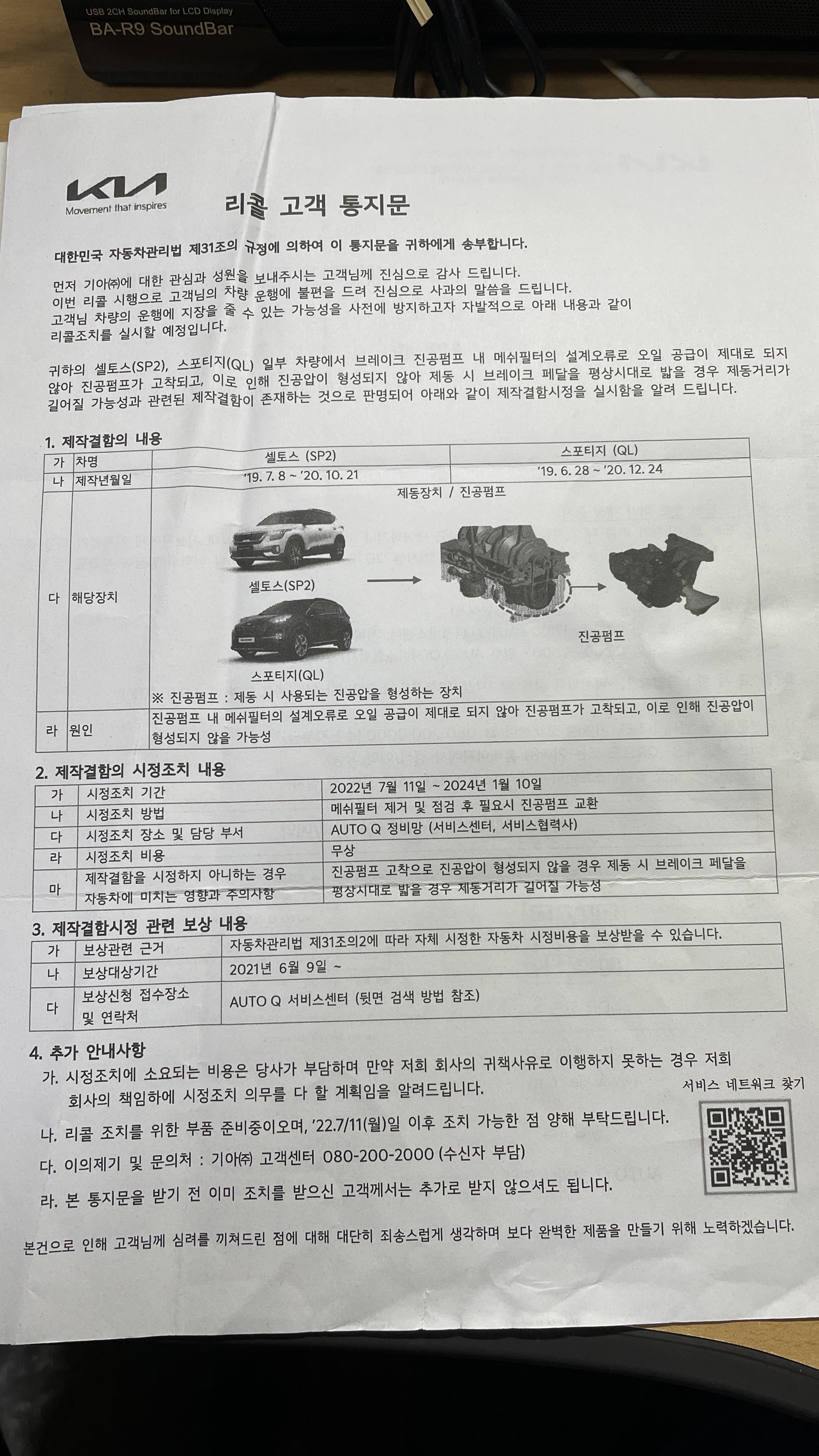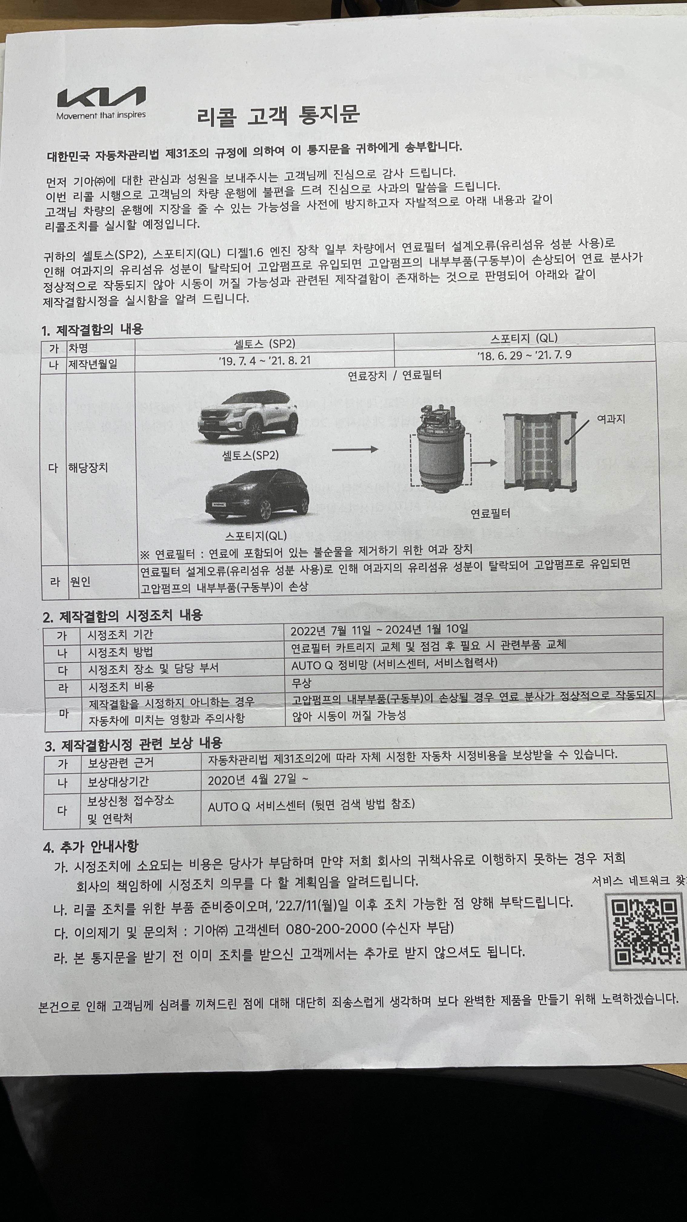 2통 모두 제가 타는 셀토스의 리콜 고객 통지문이었습니다.