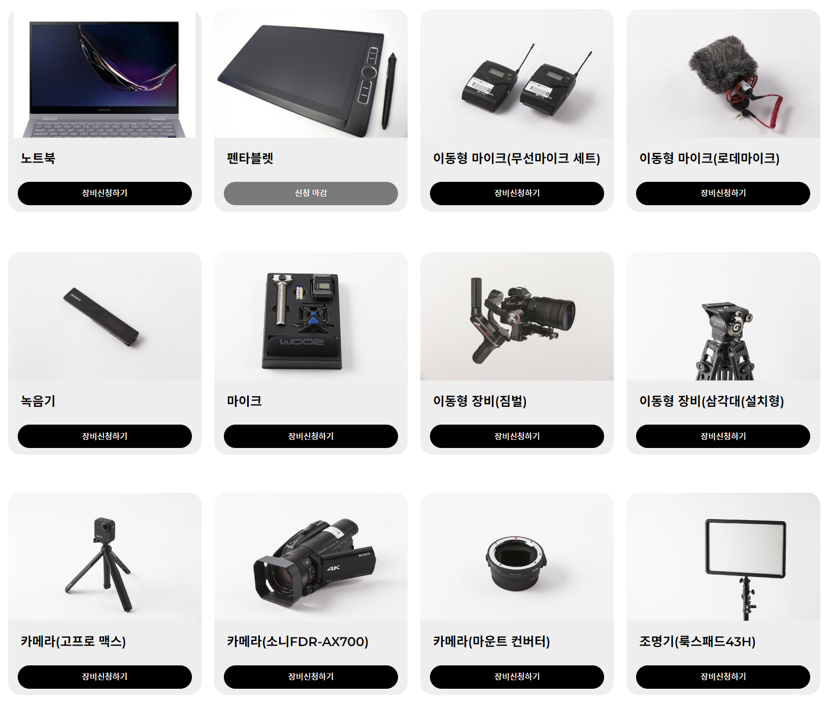 개인이 준비하기 부담스러운 스튜디오, 스트리밍실 등의 시설과, 촬영용 카메라, 고프로, 이동형 카메라 장비(짐벌), 무선마이크, 카메라 삼각대 등 장비를 이용하고 있다네요.