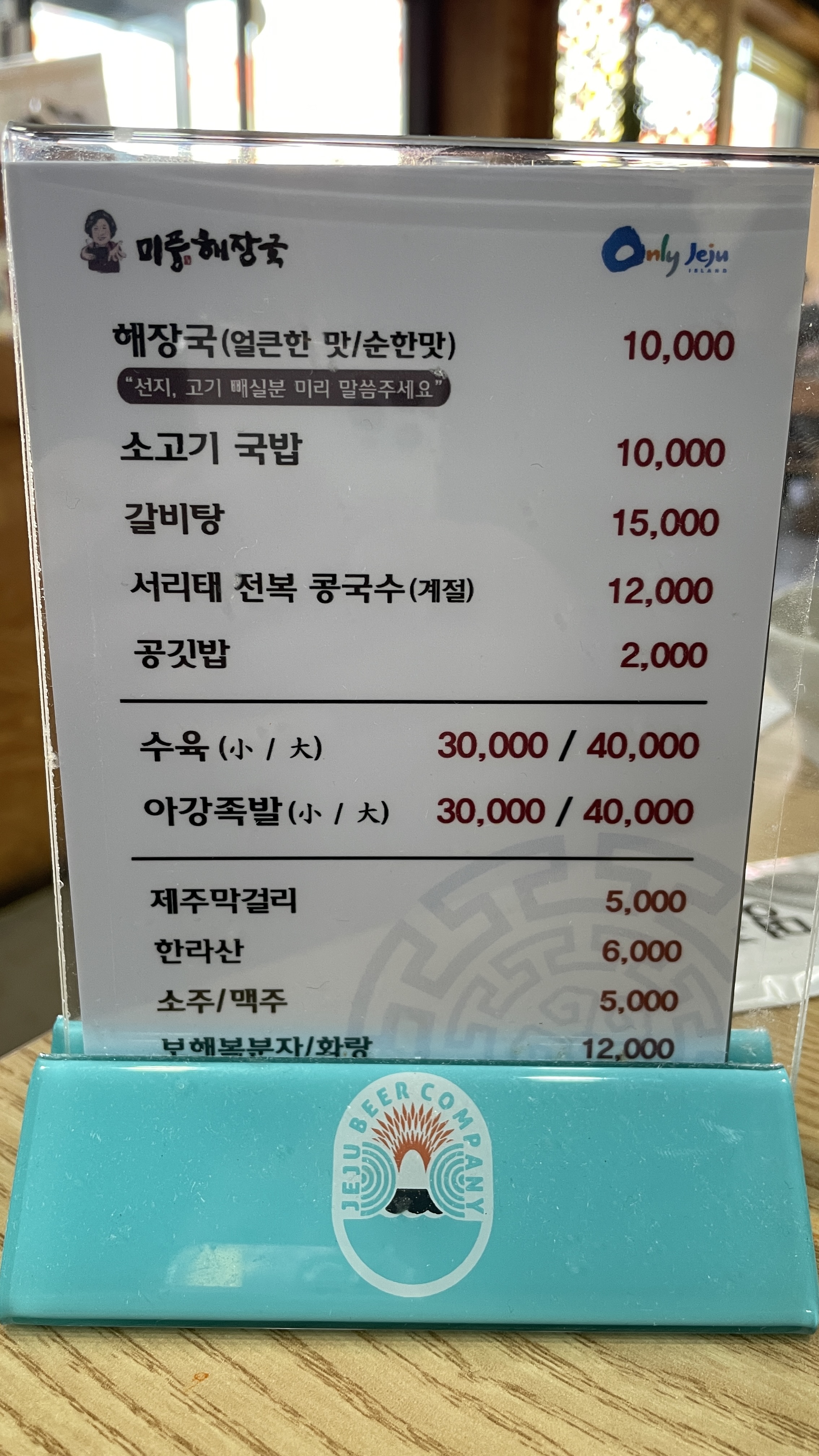 미풍해장국 대구본점의 메뉴는 해장국, 소고기국밥, 갈비탕, 서리태 전복 콩국수(계절), 수육, 아강족발과 제주막걸리, 제주도를 대표하는 한라산 소주까지 있답니다. 한라산 소주는 제주에서는 17년 21년이라고 통용되죠.