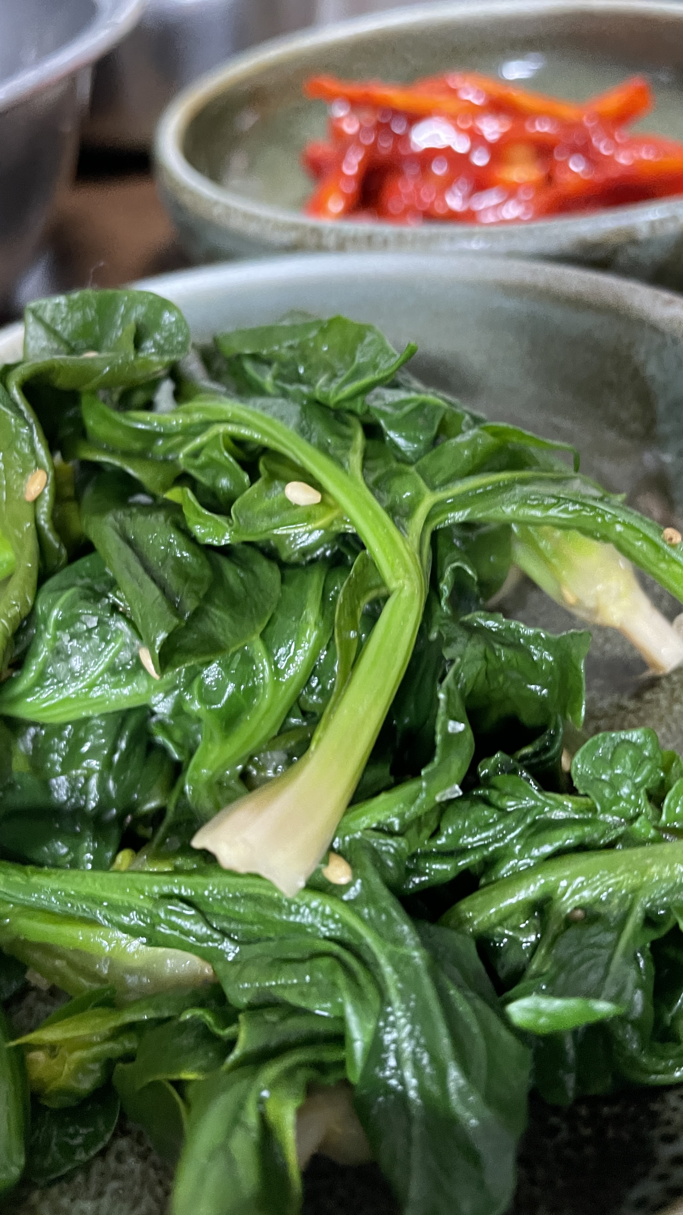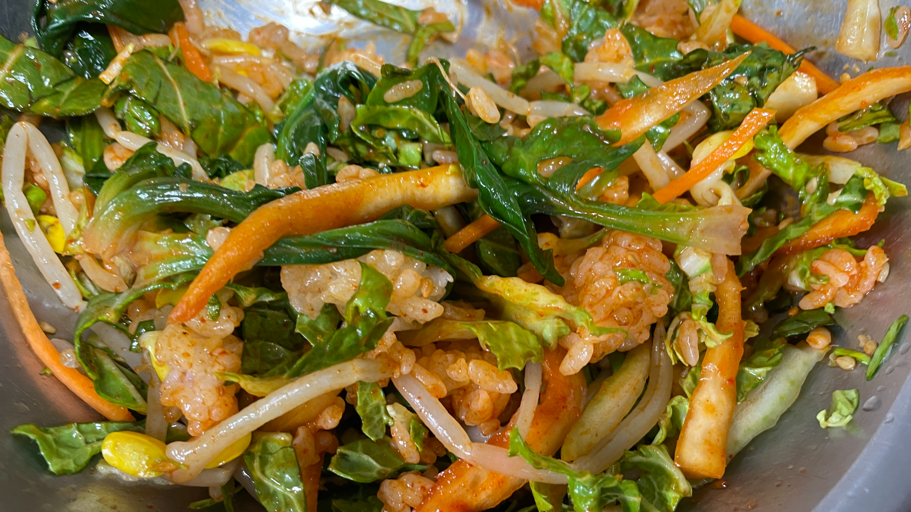 반찬으로 나온 콩나물, 시금치, 도라지무침을 함께 넣어 비볐습니다.