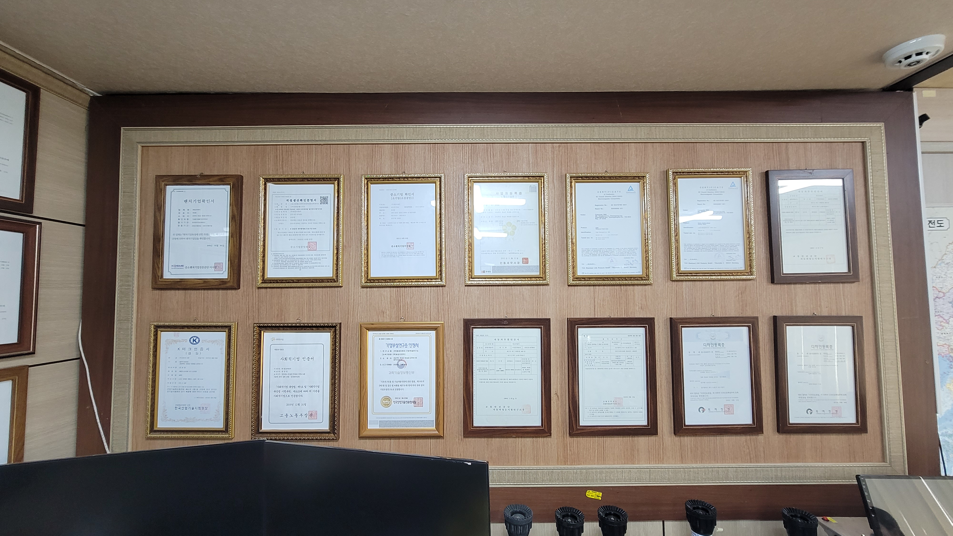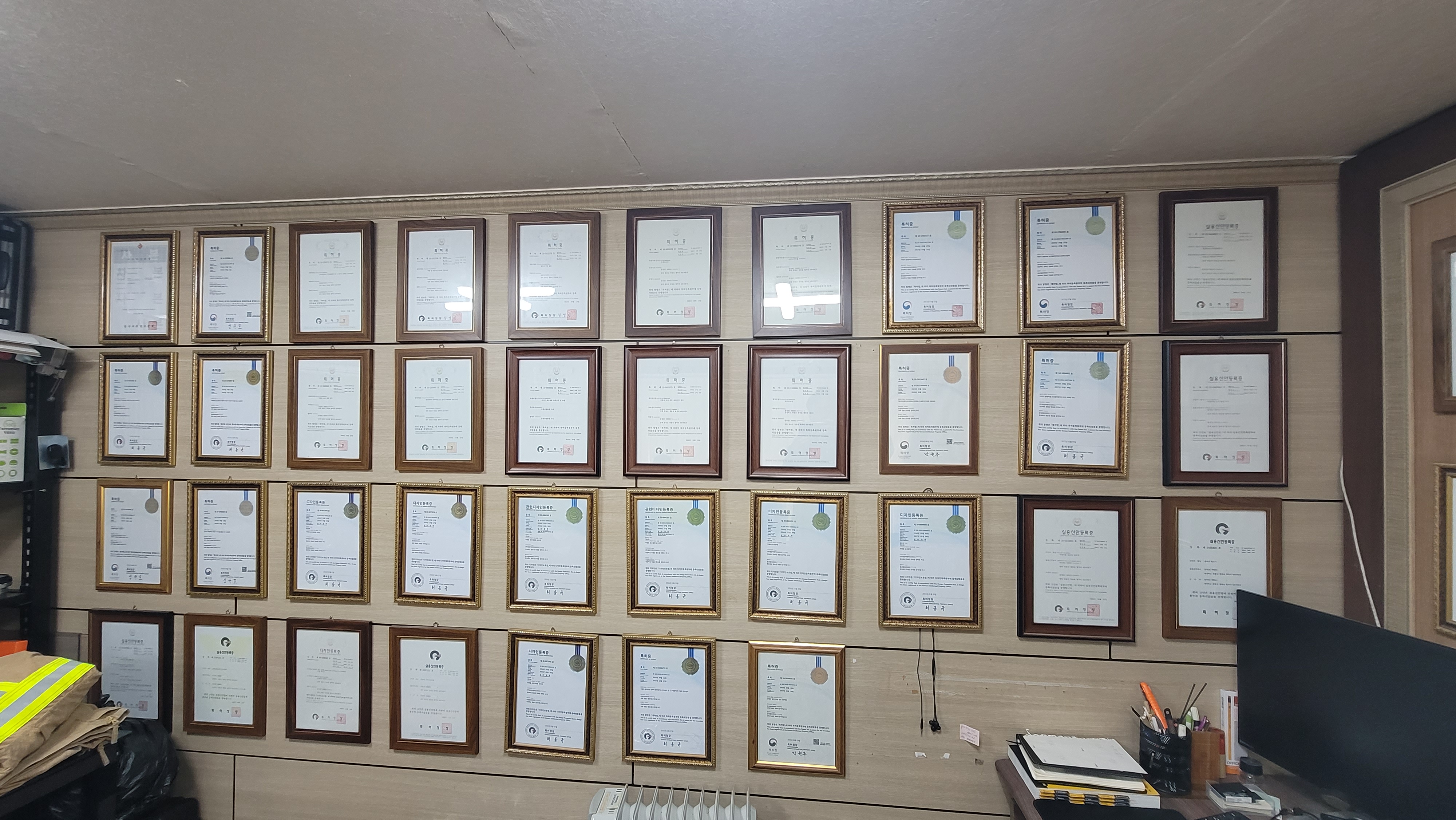 미팅을 위해서 사무공간으로 들어갔는데 벽면 2개를 특허, 인증서 등으로 도배를 해두셨더군요. 회사 규모에 비해 특허, 실용신안 등의 지식재산권을 다수 보유하고 있었습니다.