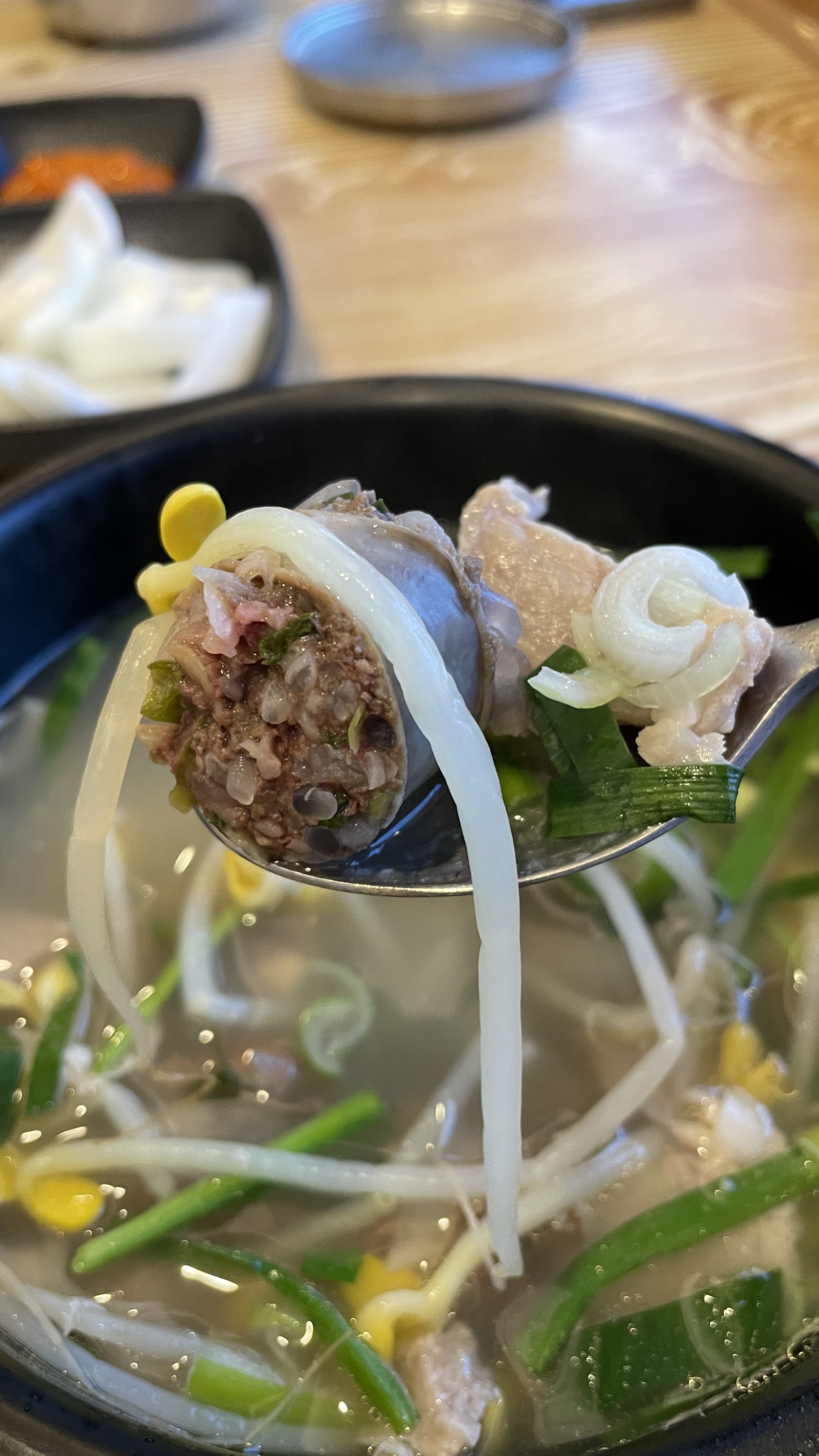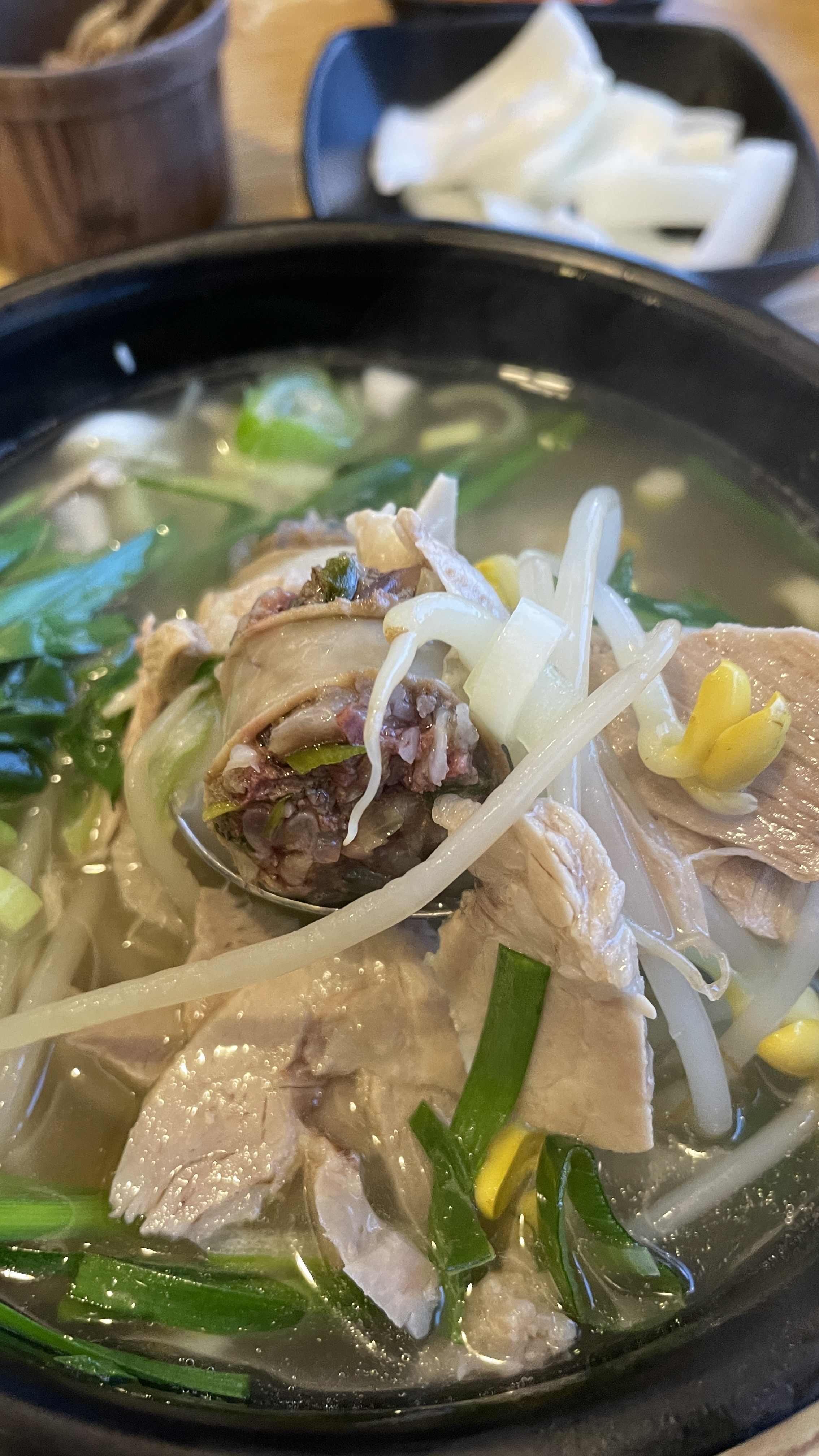 가득한 공깃밥과 부추, 콩나물이 들어간 맑은 순대국밥. 소소국밥의 대표메뉴. 소소국밥의 맑은 순대국밥이나 맑은 돼지국밥 등은 맑은 육수와 콩나물이 보이는 특징이고, 보이지는 않지만 황칠나무 가루를 넣고 끓인 것이 포인트이다. 나는 황칠나무가 뭔지는 모르지만 몸에 좋다니 기분은 좋다. 내 나이쯤 되면 몸에 좋은 음식은 찾아서 먹으니까.