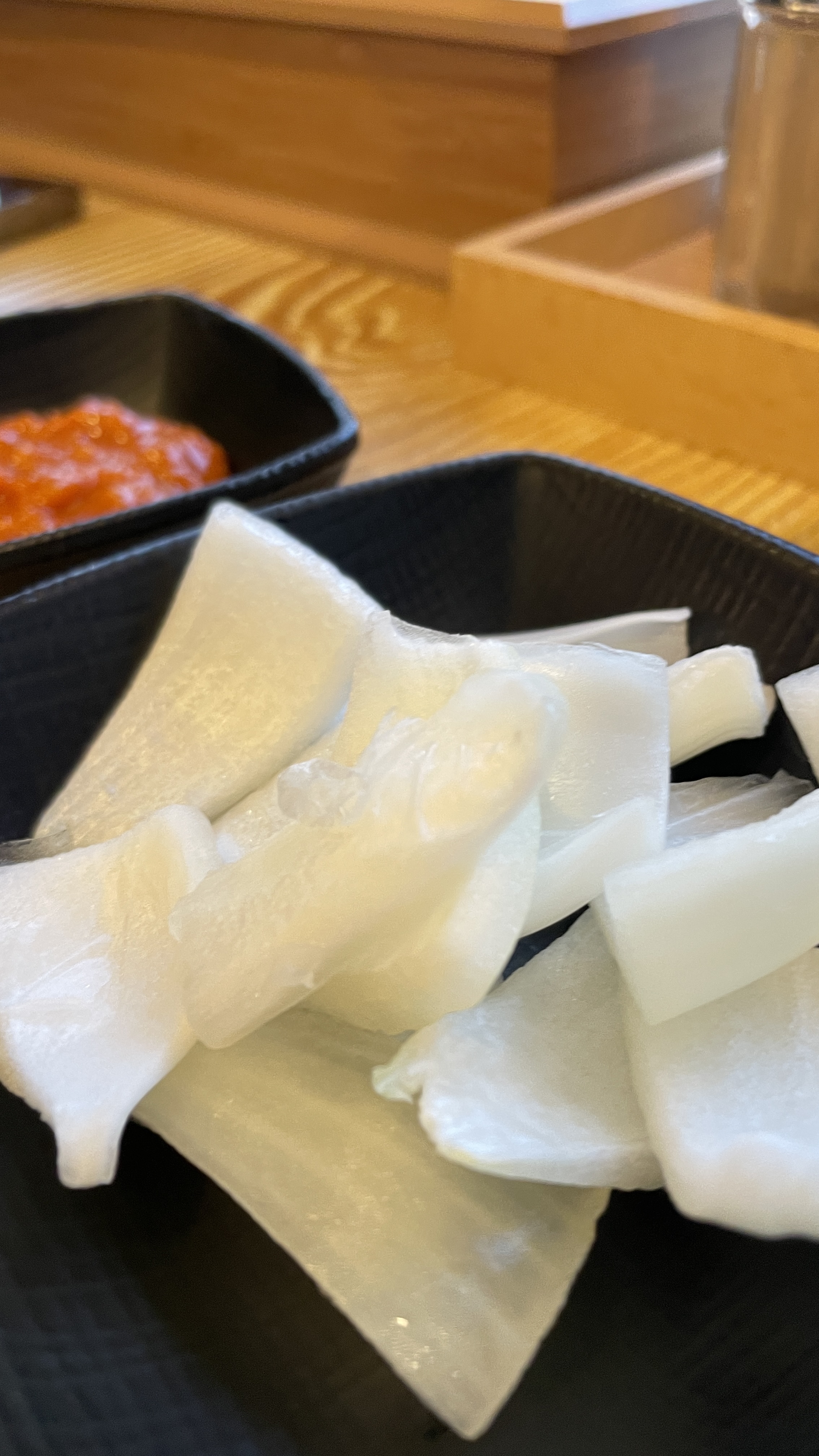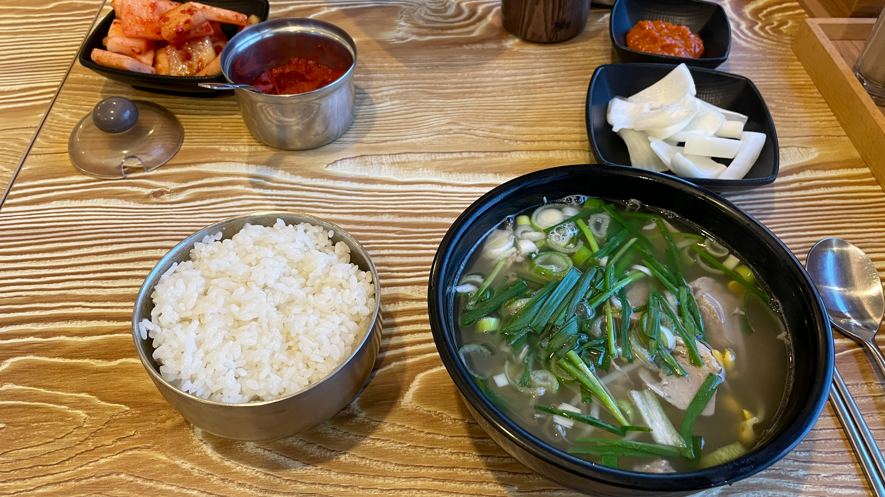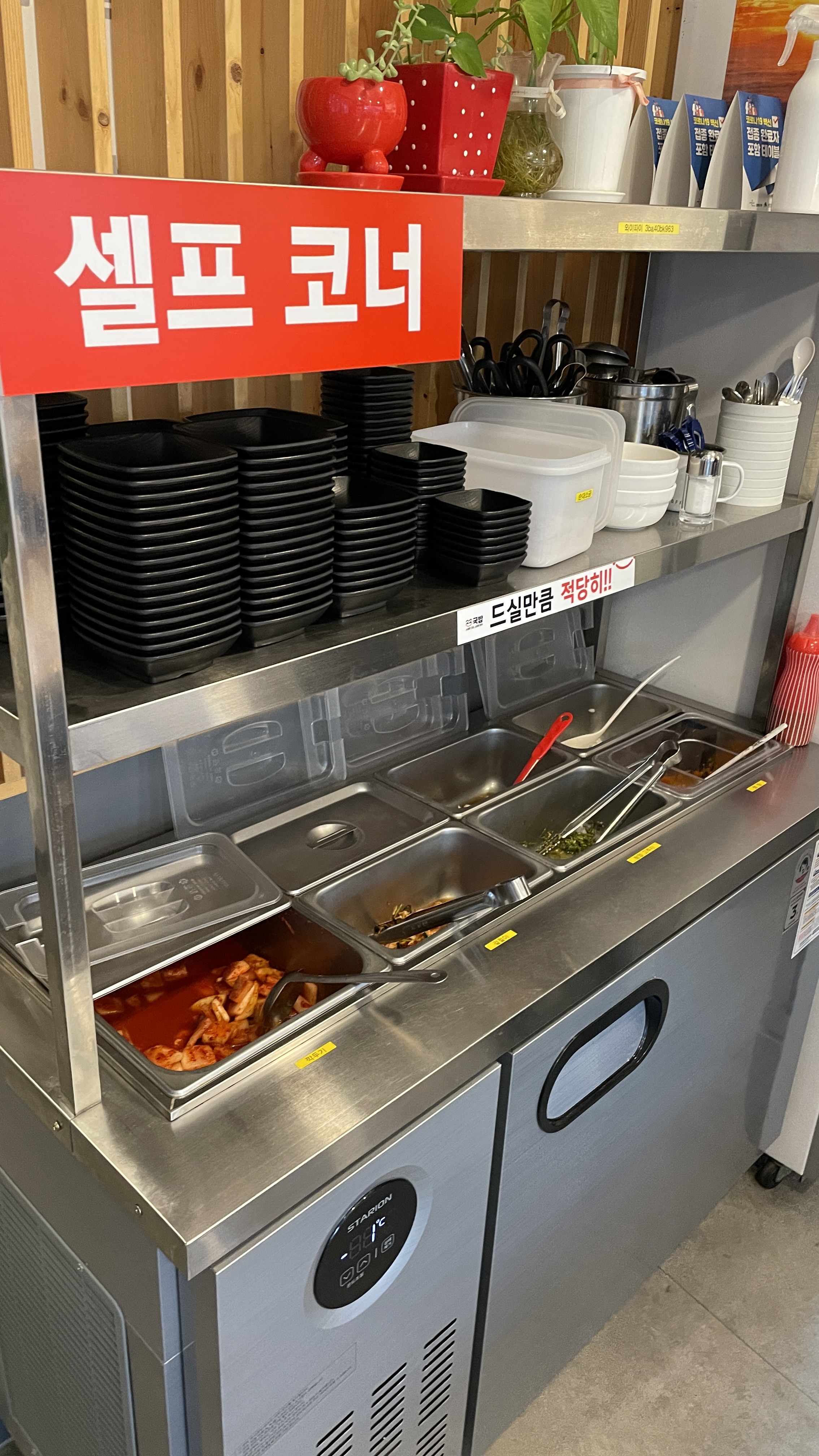 셀프코너에서 제공하는 반찬은 3가지 인데, 고추다짐은 빼고 깍두기와 양파와 쌈장만 챙겼다. 굳이 먹지 않는 반찬 덜어서 남길 이유가 없으니까.