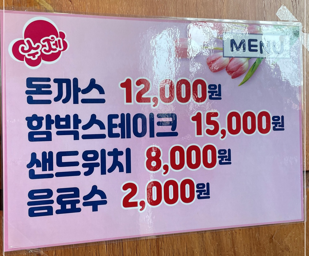 메뉴는 딱 3가지, 돈까스 12,000원, 함박스테이크 15,000원, 샌드위치 8,000원이고요, 음료수는 2,000원입니다