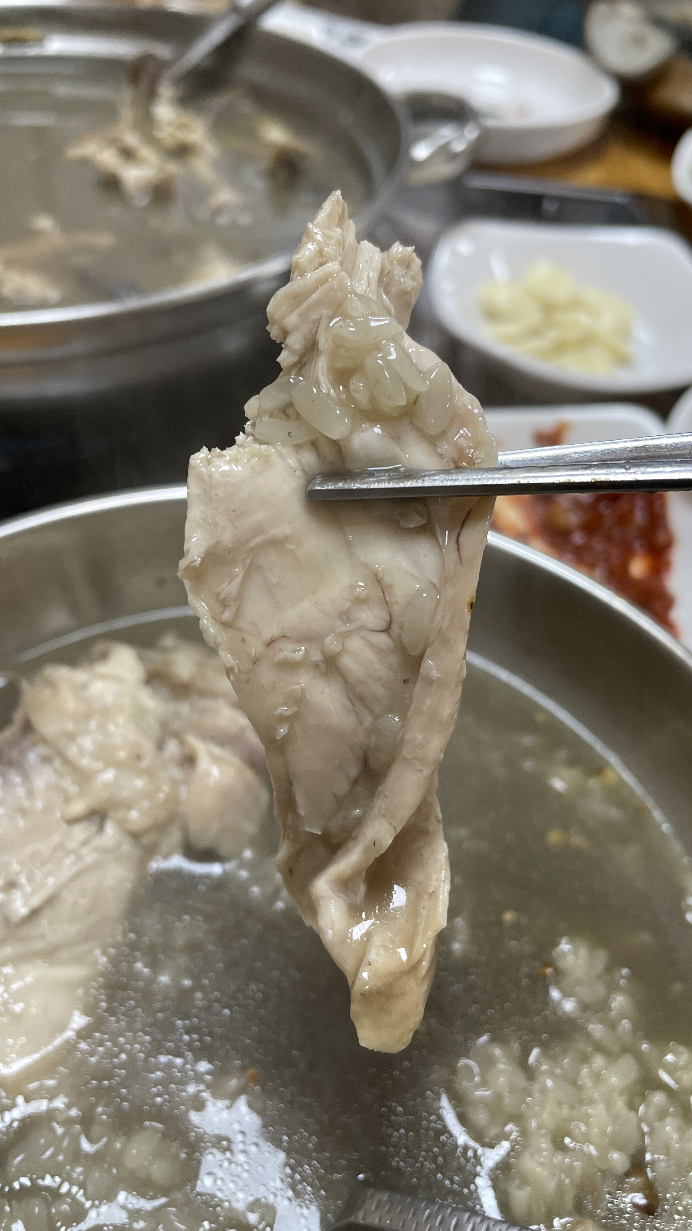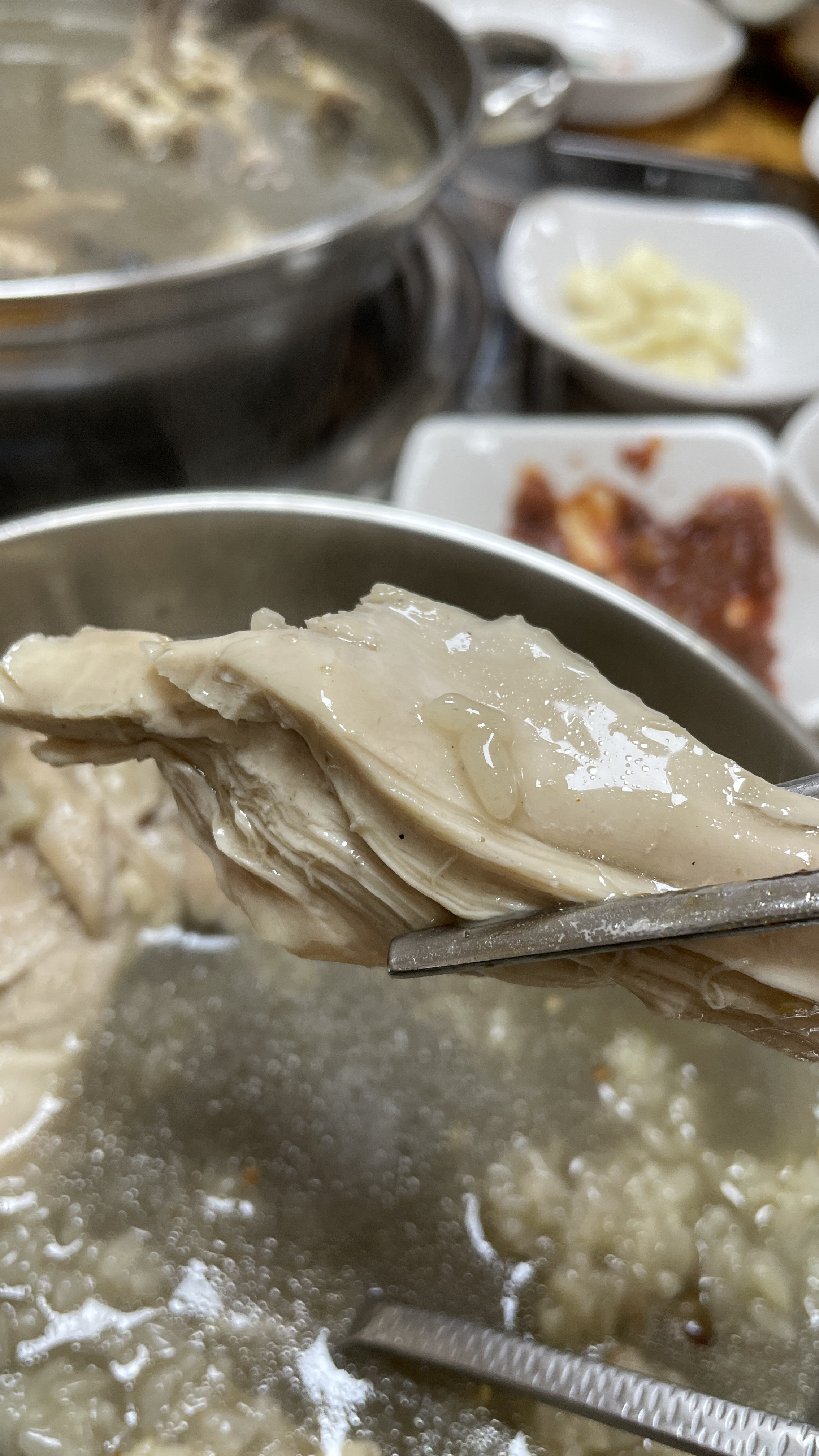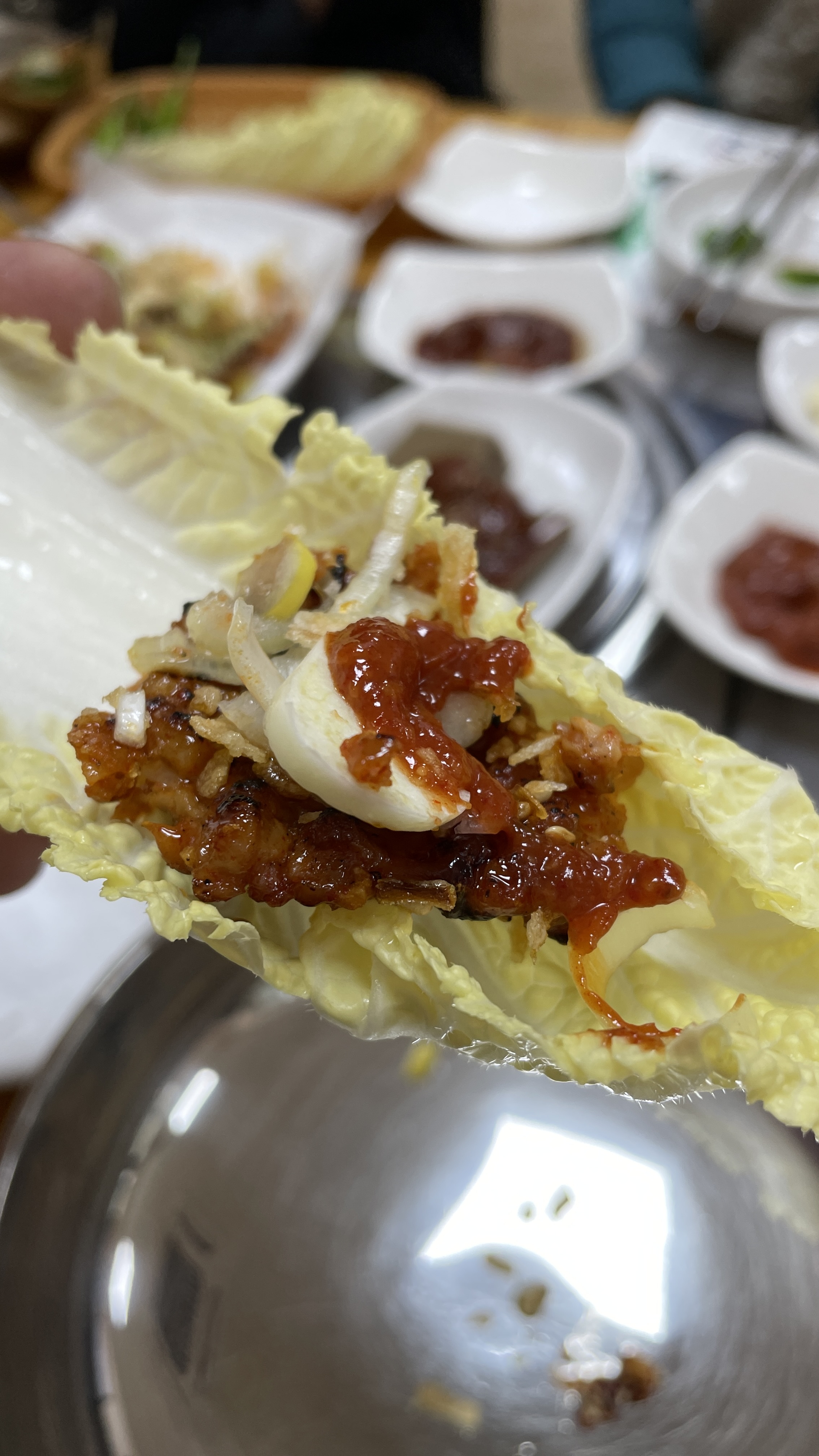 멋 모르고 그냥 먹었는데, 알배추 잎에 싸서 먹어야 제맛이랍니다. 한국인의 밥상에는 역시나 쌈이 빠지지 않습니다. 배추의 아삭함과 닭고기의 부드러운 맛이 조화를 잘 이뤘습니다.