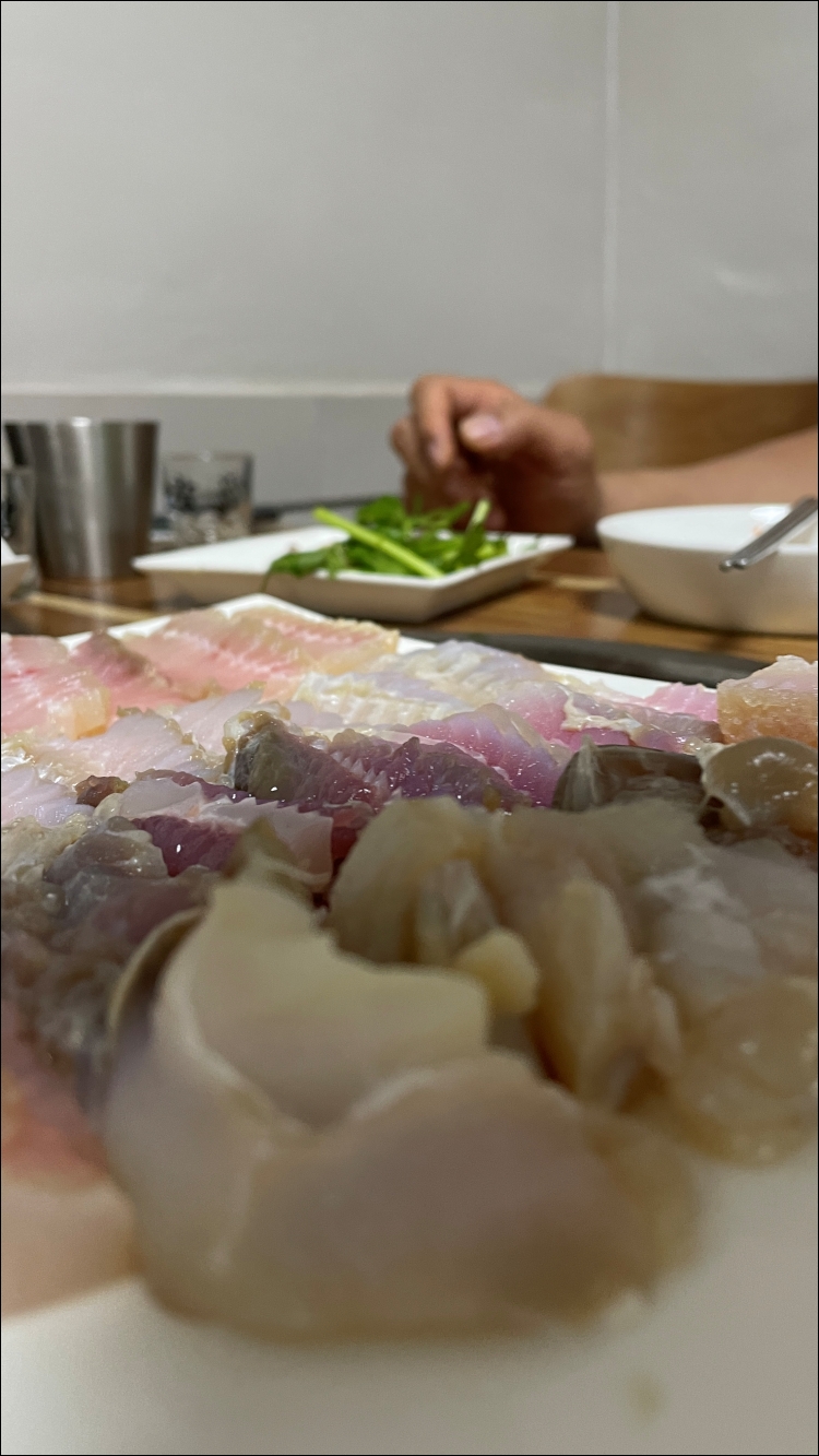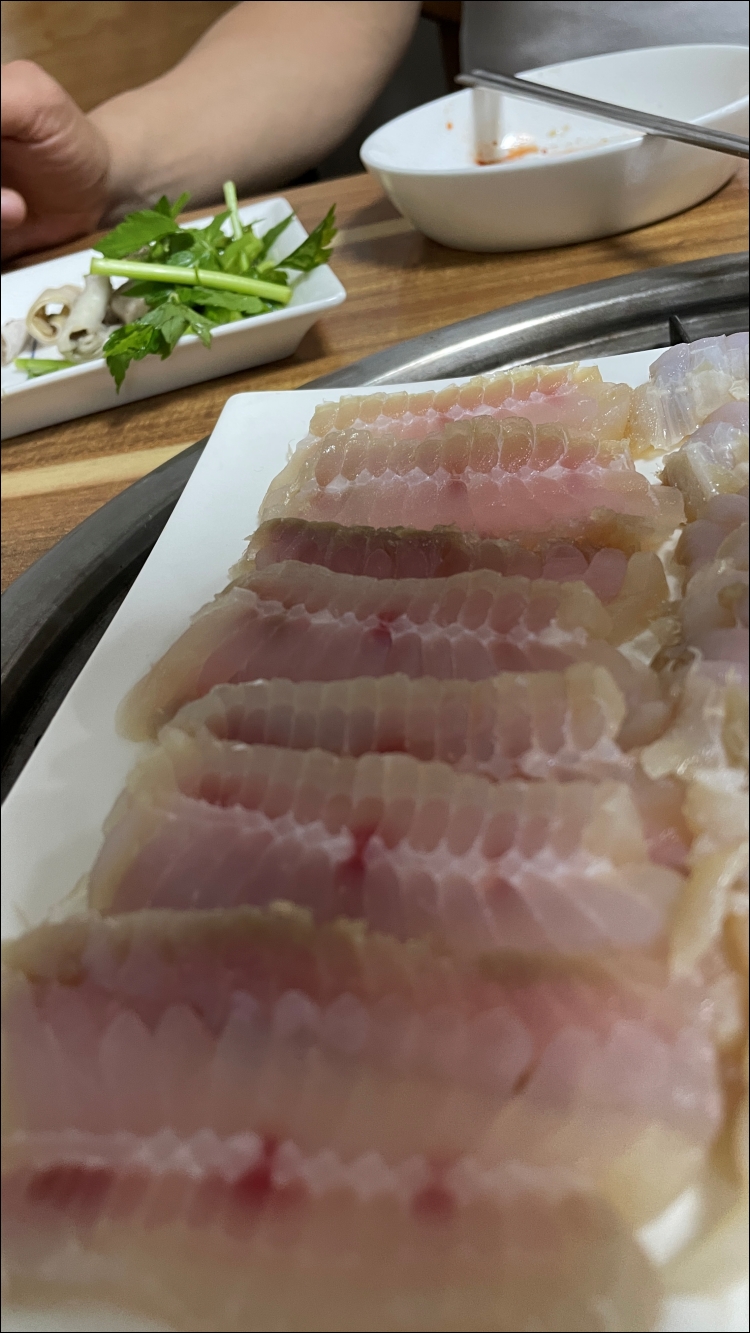 저는 제가 앉은 테이블에 있는 복어불고기를 독점하다시피 했습니다. 다들 홍어의 매력에 빠지셔서 제가 많이 먹게 되었습니다.