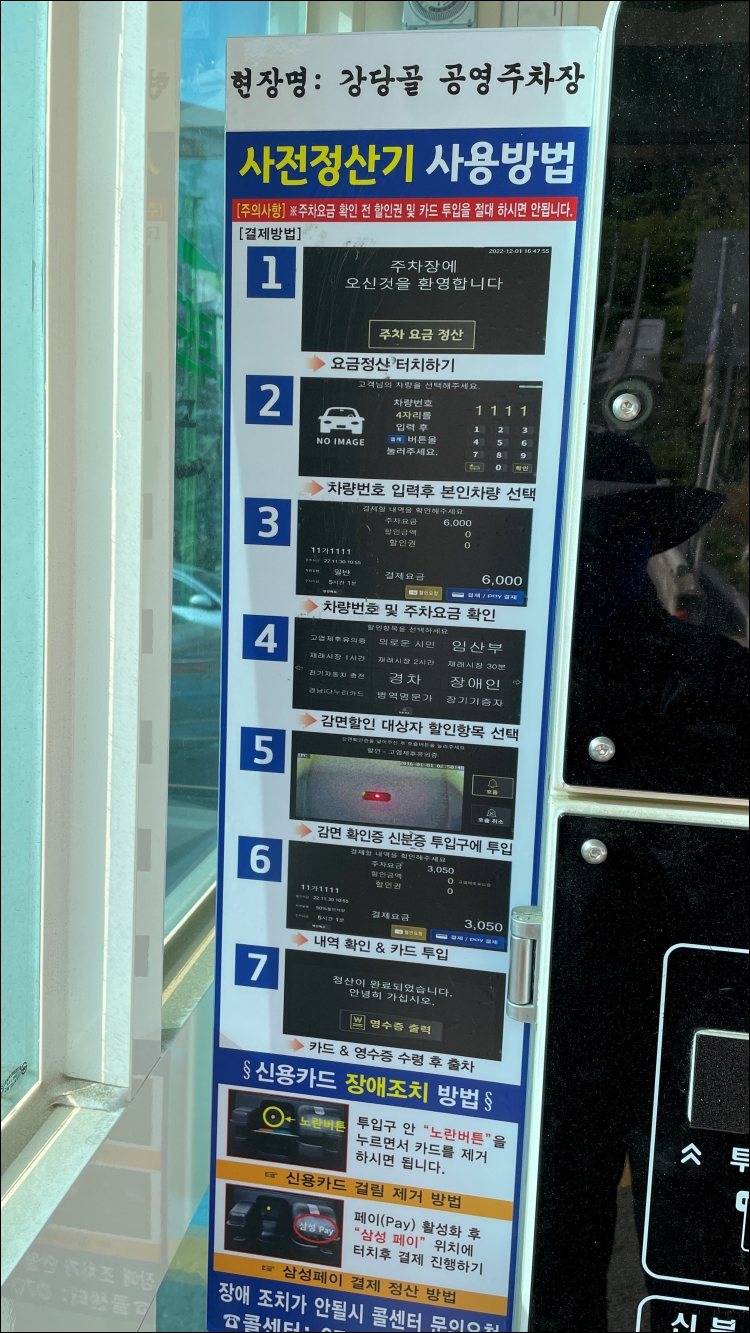 화면터치 후에 차량번호 입력하고, 자기차량 확인하고, 감면 혜택이 있으면 대상자 선택 및 신분증 투입하고 카드를 넣고 결제하게 되어 있더군요.