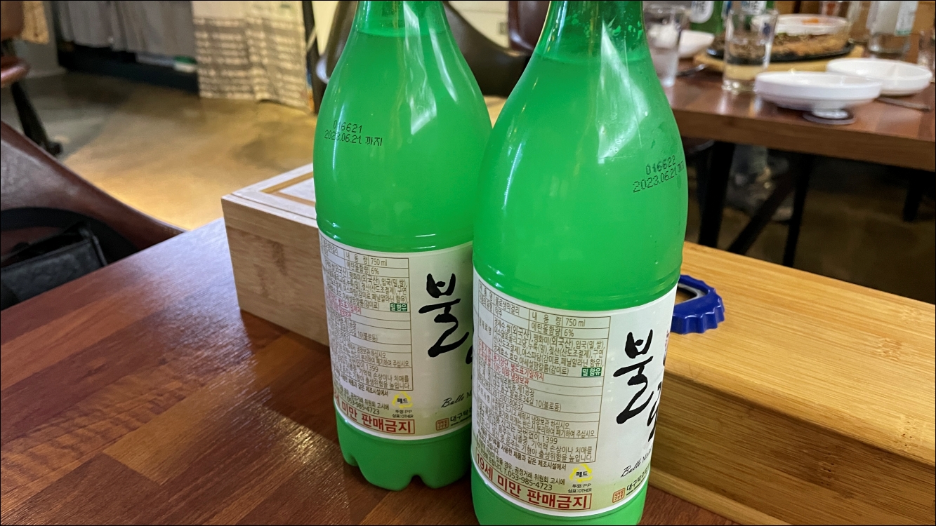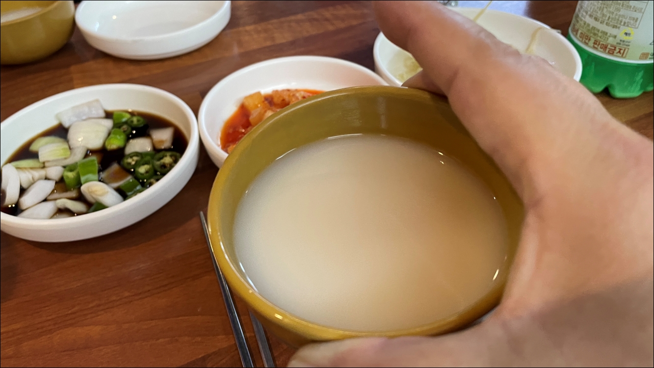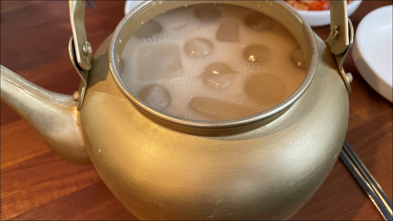 기본 반찬을 앞에 두고 시원한 얼음막걸리 드링킹