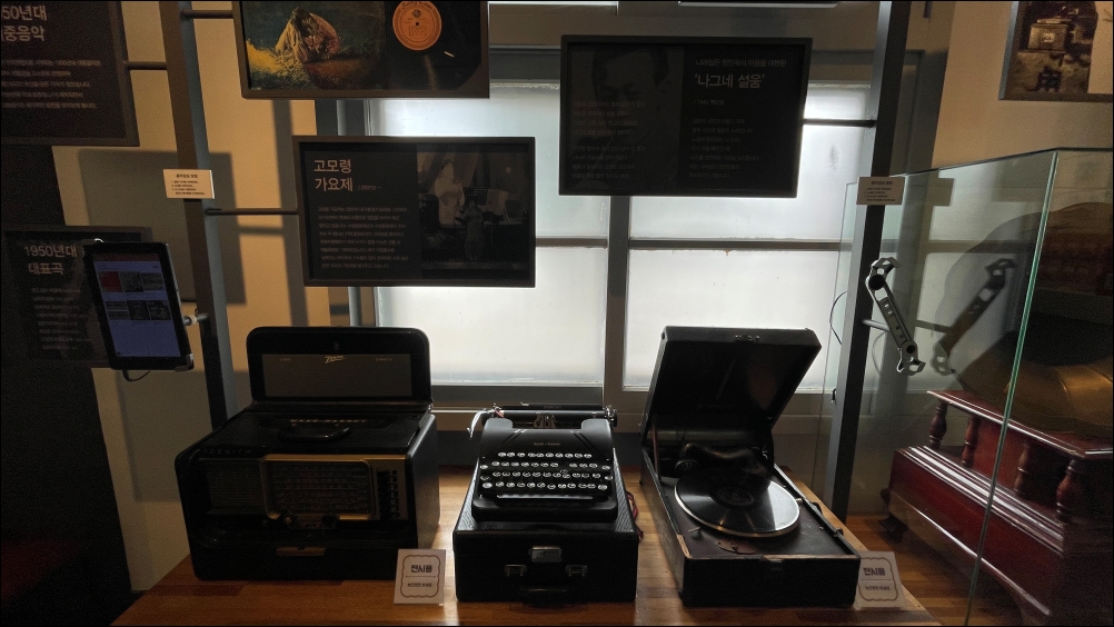 작은 역 공간에 옛날 물건들(축음기, 타자기, 라디오 등)과 고모역에 관련된 기록들이 전시되어 있습니다.