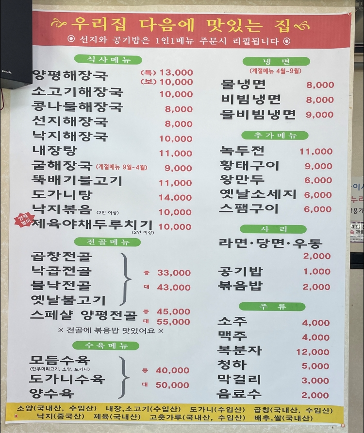 양평해장국 보통 10,000, 특 13,000원