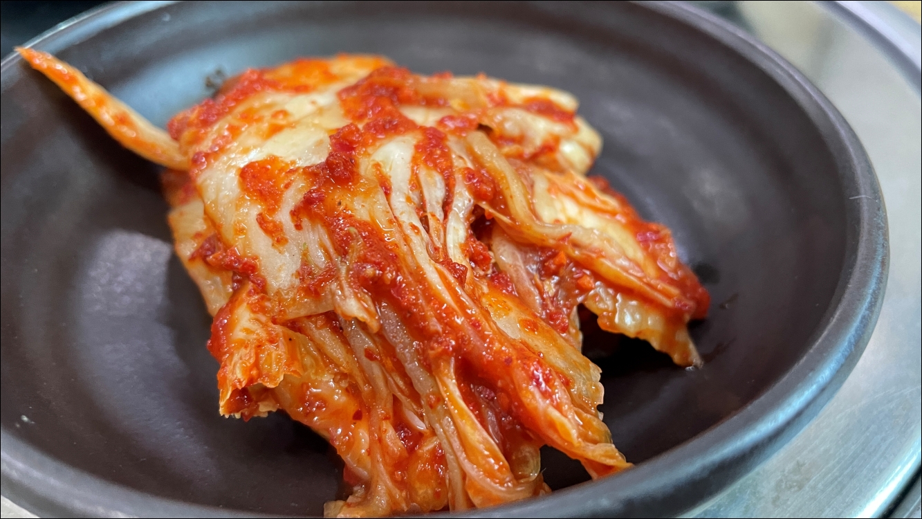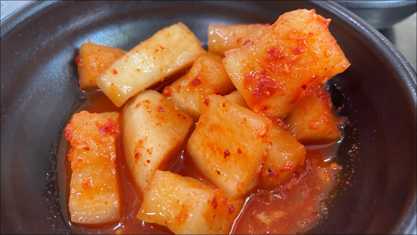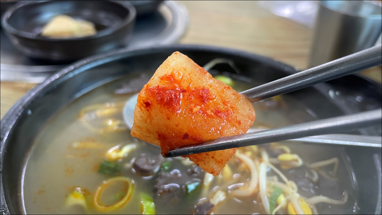 해장국이 나오기 전에 김치 한 조각, 깍두기 하나 먹어봤는데 입맛에 잘 맞았습니다. 해장국집에서 중요한 반찬이 바로 김치 종류인데, 비법을 알고 싶을 정도입니다.
