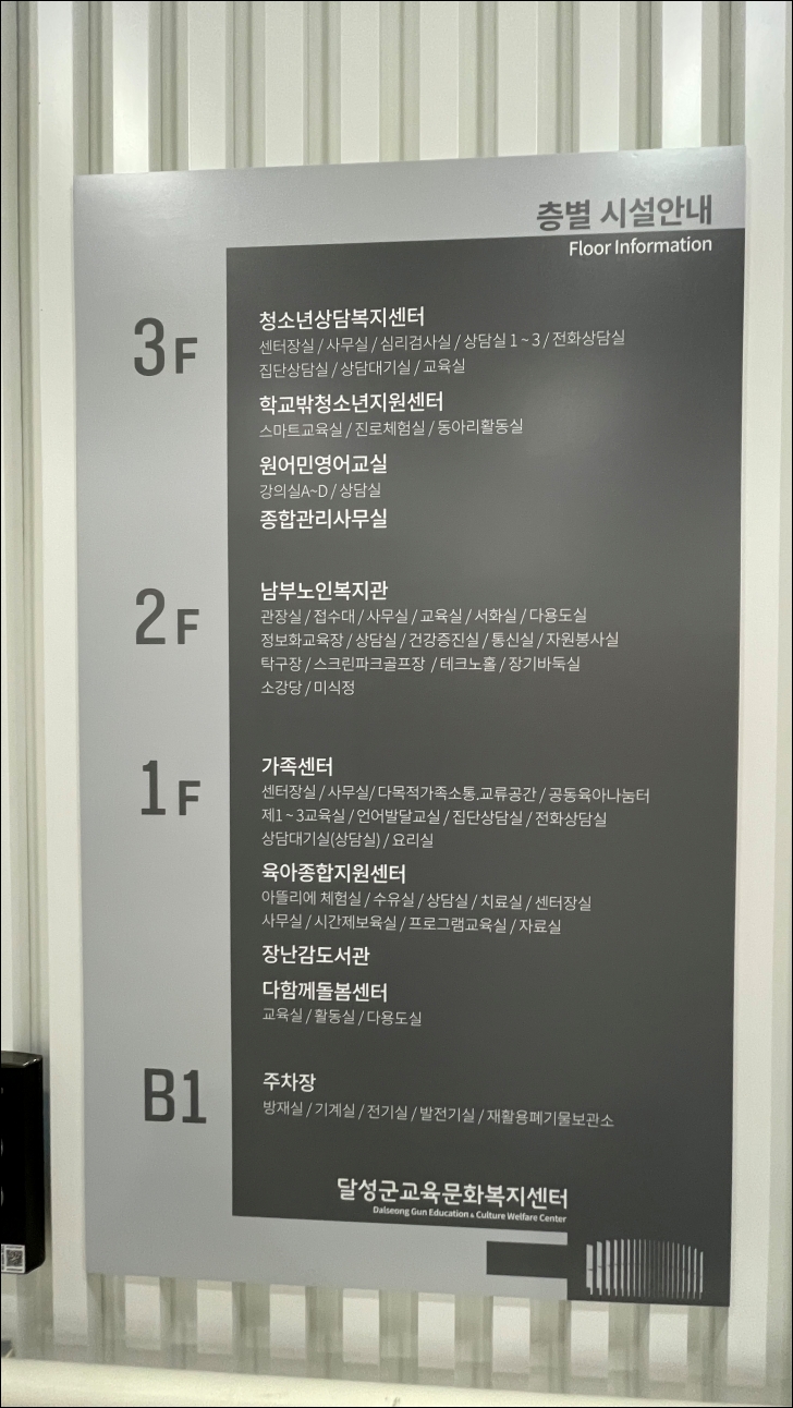 1층에는 달성군 가족센터, 육아종합지원센터, 장난감도서관 다함께 돌봄센터, 2층에는 남부노인복지관, 3층에는 청소년상담복지센터, 학교밖청소년지원센터, 원어민영어교실 등이 입주를 했답니다.