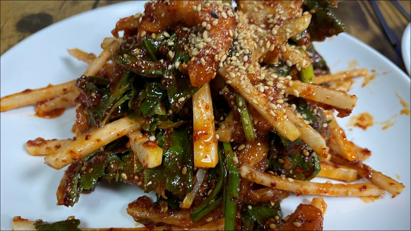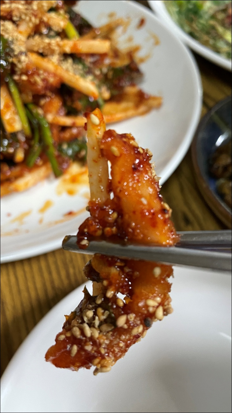 엄마손동동주 왼쪽 구석에 자리를 잡고 홍화동동주 한 사발은 기본이고 매콤한 땡초부추전과 가오리무침을 주문했다. 세명이서 1인 1안주를 실천하기 위해서......