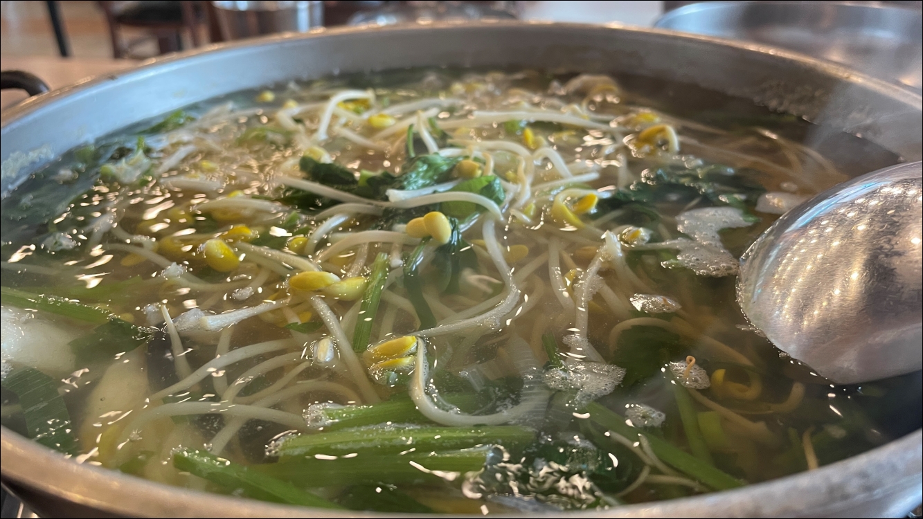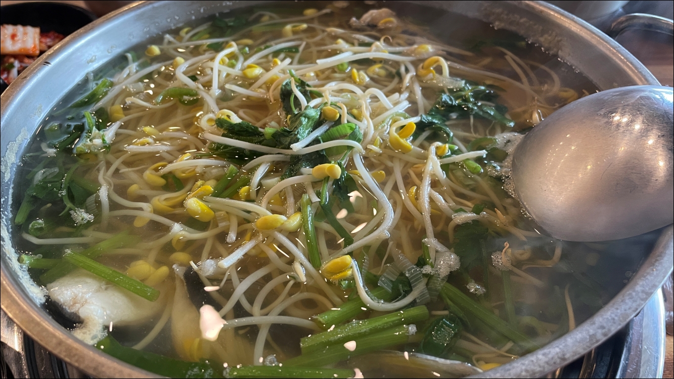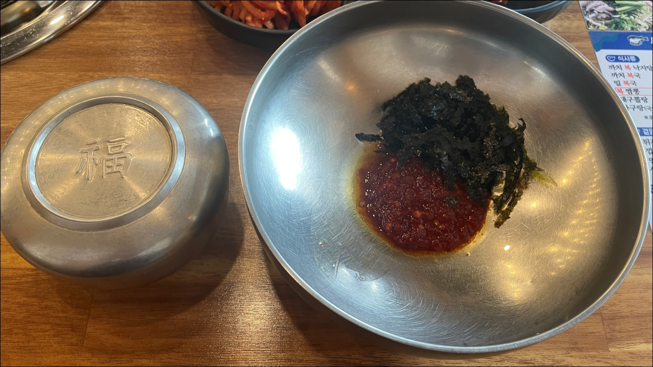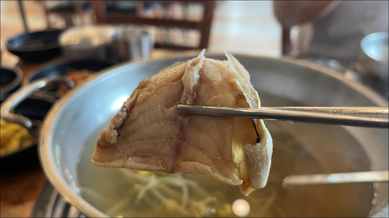 테이블에서 밀복국이 보글보글 끓는데 군침이 삭 돌더군요.
