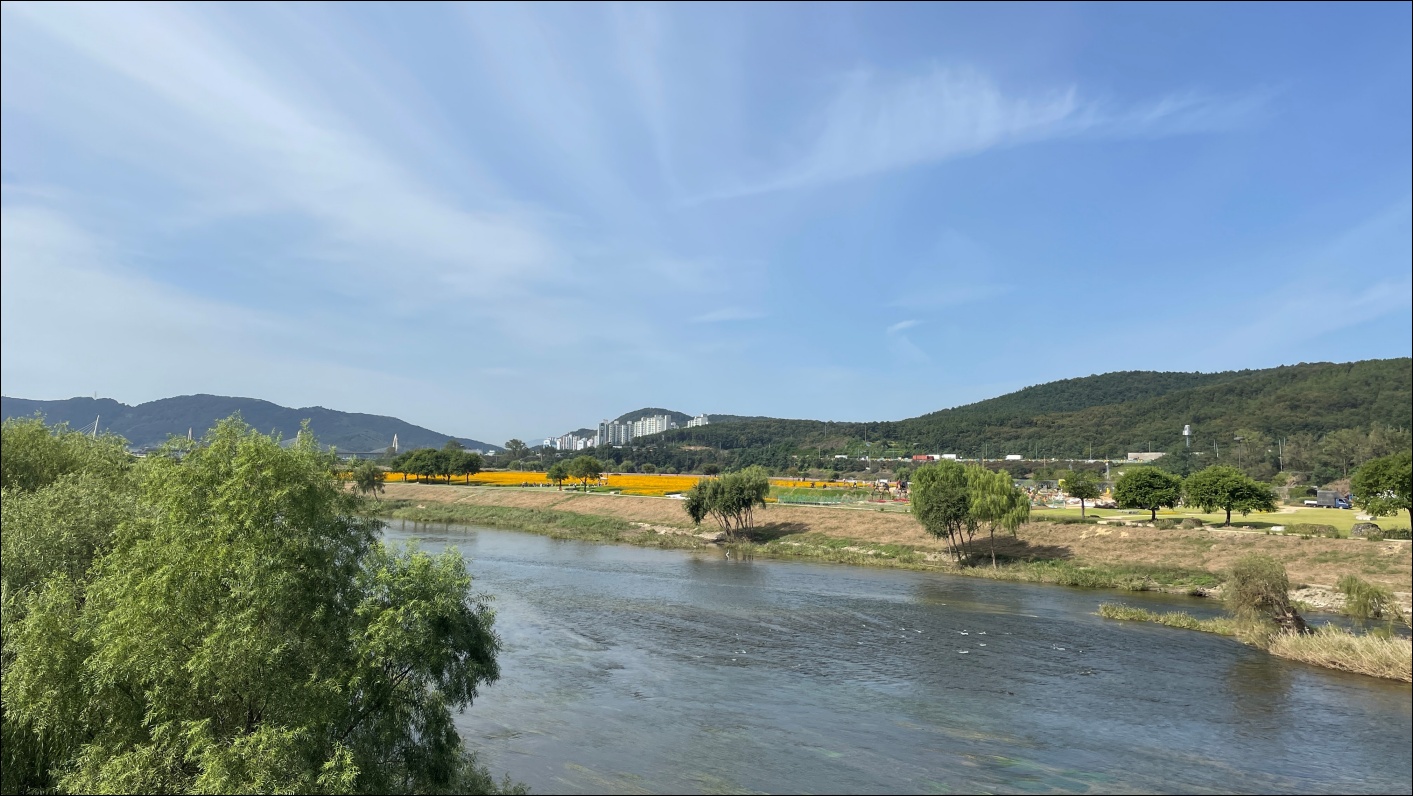 노곡교 아래에 주차하고 다리를 건너는데 멀리 황화코스모스의노란 물결이 보이기 시작했습니다.