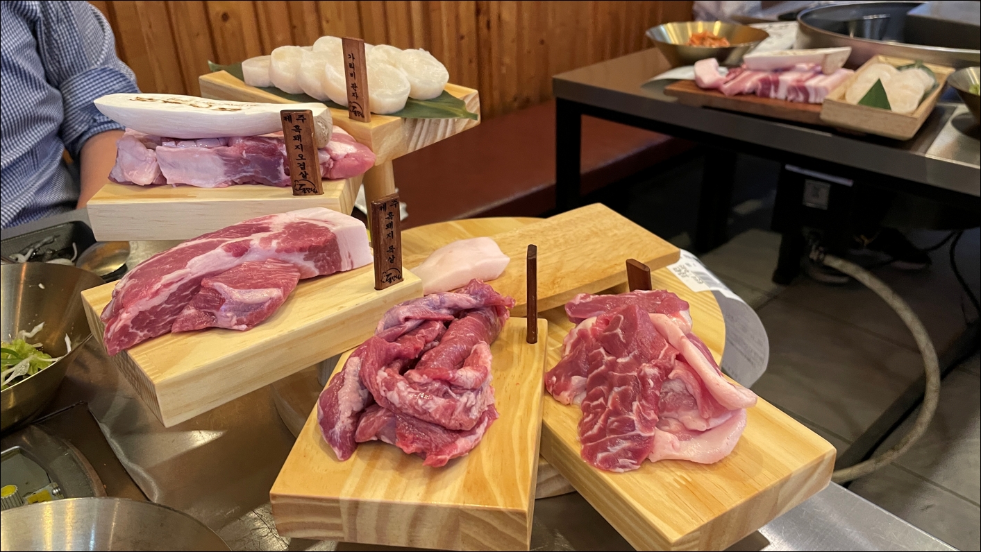 그리고 등장한 제주도흑돼지 오겹살 전문점 돈모닝의 모듬세트입니다. 환상적이지 않습니까? 음식을 어떻게 내느냐도 중요한 요소이니까요. 두툼한 두께의 고기를 계단식으로 배치하셨는데 저절로 맛있겠다는 생각이 들었습니다.