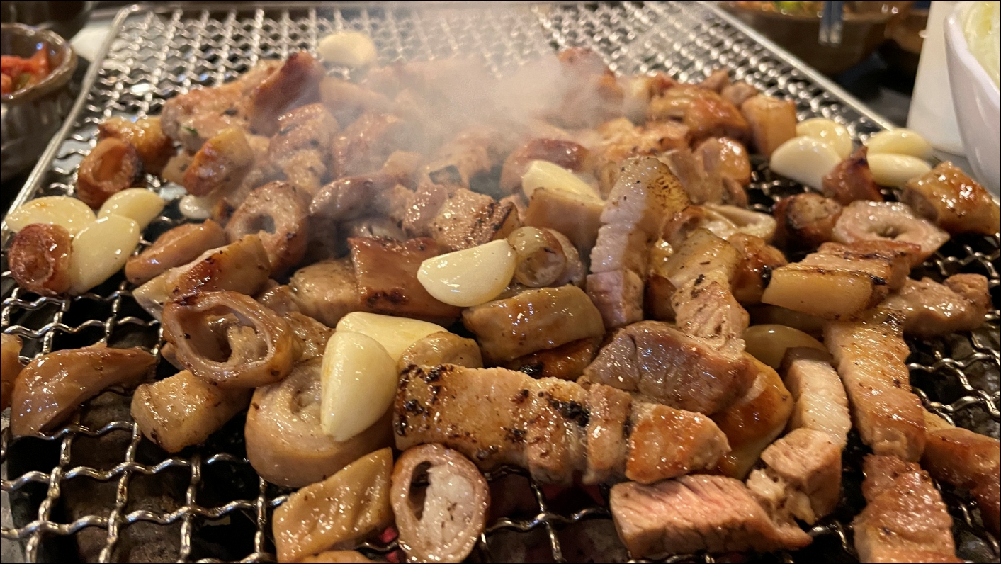 대구 남구 구공탄막창에서는 기본적인 상차림이 끝난 다음 초벌된 막창과 삼겹살이 나왔다. 거의 구워진 것 같아 굽는데 크게 수고스럽지는 않았다.