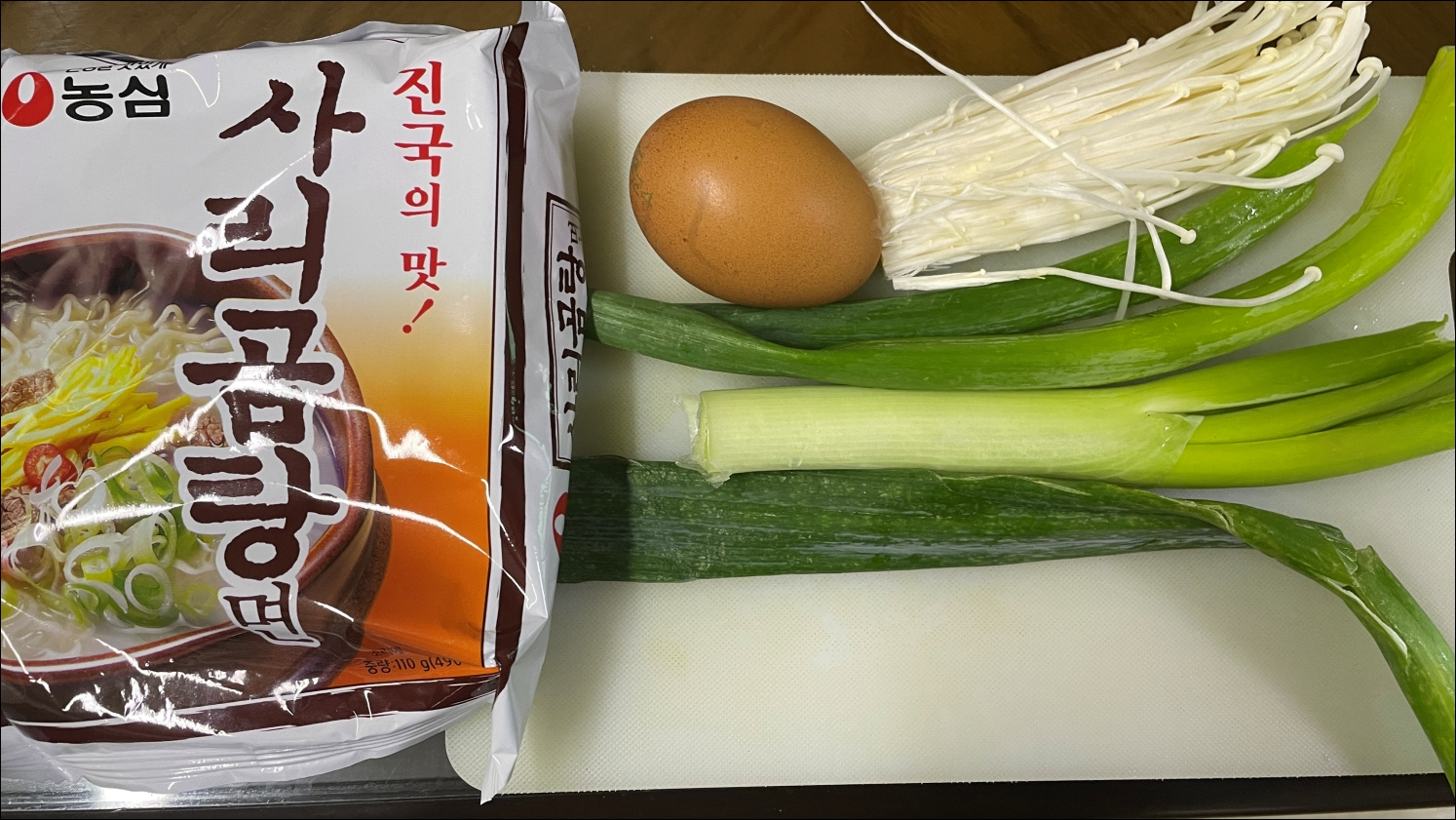 일단 농심에서 만든 "사리곰탕면" 라면이 하나 있어야 합니다. 중요한 레시피로는 고운 고추가루, 대파, 계란 정도입니다. 냉장고에 보니 버섯, 콩나물, 고사리가 있어서 저는 함께 끓였습니다. 후추는 식성에 따라 넣으셔도 되고 안 넣어도 됩니다. 저는 있어서 팍팍 넣었습니다.