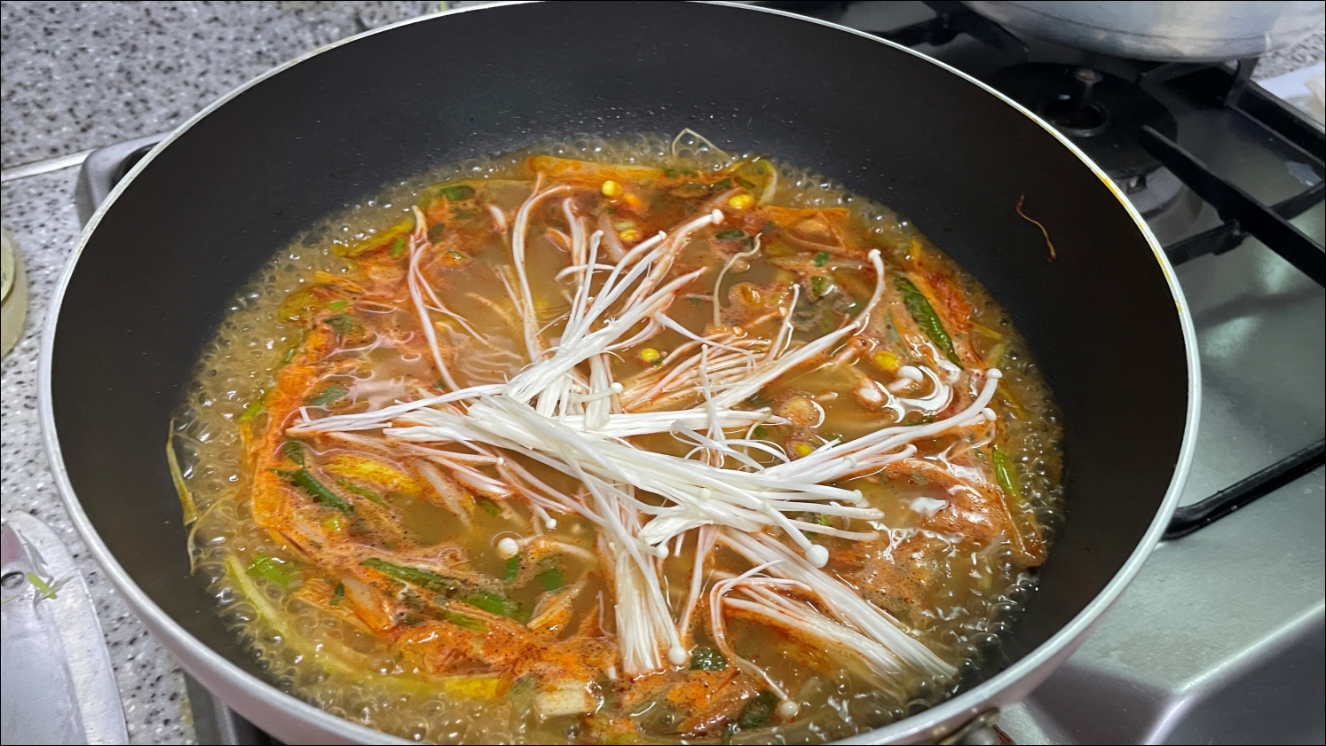 ③ 귀차니즘으로 인해 물 붓고, 콩나물, 고사리, 스프를 한 번에 넣고 끓였습니다. 버섯도 같이 넣었어야 했는데 잠시 잊고 있다가 뒤늦게 넣었습니다. 사실 꼭 같이 넣어야 하는 것은 아닙니다.