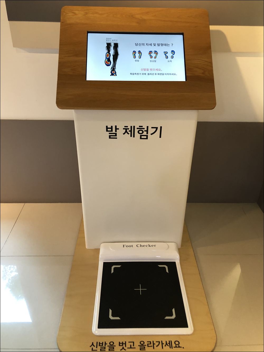 신발을 벗고 올라서면 되는데요 발형태에 대해 확인해 볼 수 있기 때문입니다. 우리는 같다고 생각하겠지만 실제로 체험기에 올라 측정해 보면 지면과 닿는 발의 형태가 다르게 나오는 분들이 의외로 많습니다. 저도 마찬가지고요.