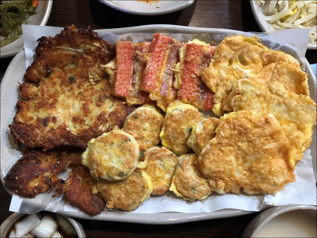 기본 반찬으로 막걸리를 마시던 중, 모듬전이 나왔습니다.