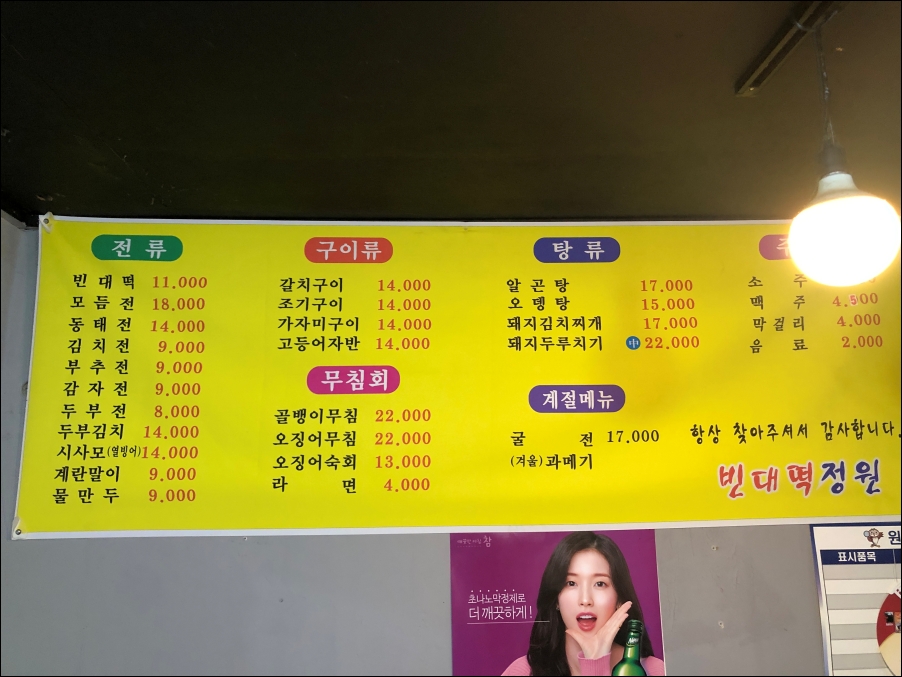 정원빈대떡 메뉴(먹은 것 위주로)