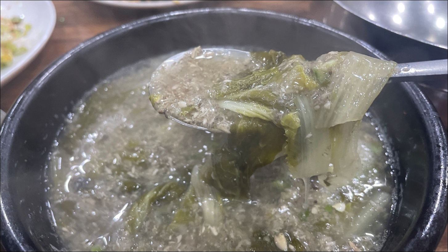 마늘과 고추를 넣고 휘휘 젓은 다음 첫 숟가락.