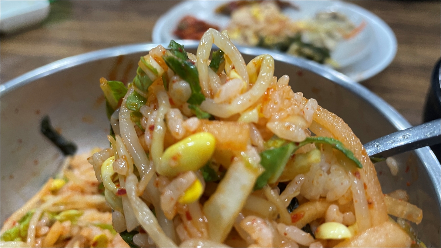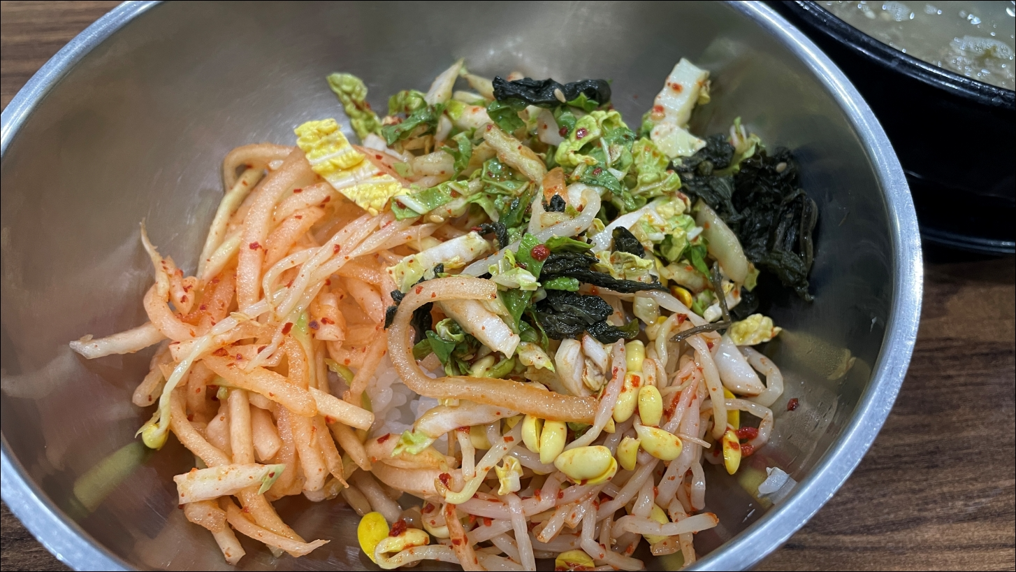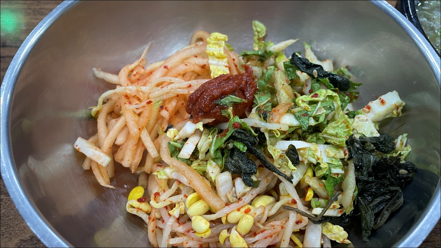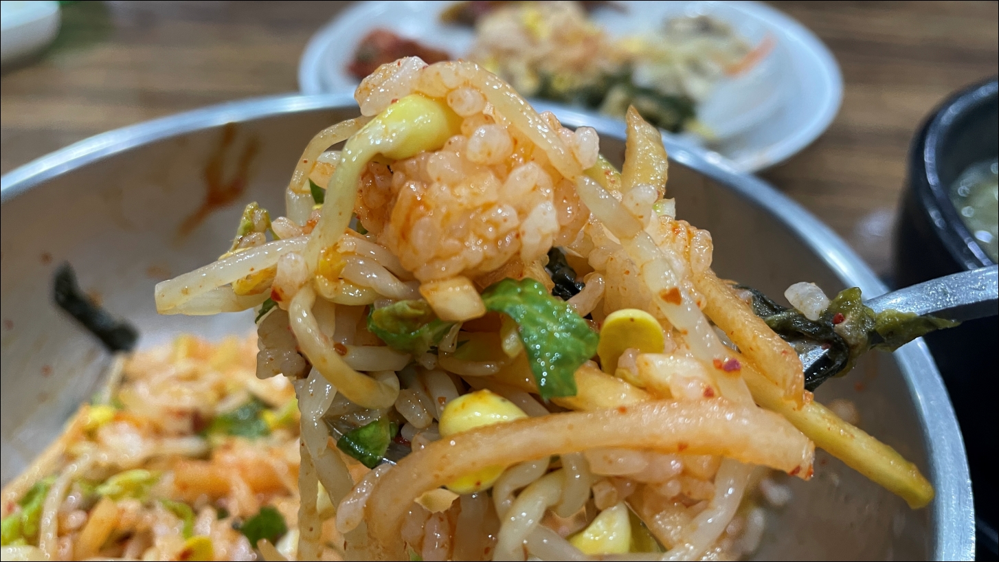 옆 테이블의 아저씨들이 밥을 비벼드시기에, 나도 대접을 하나 가져와서 반찬으로 나온 나물을 넣고 비볐다. (테이블 마다 고추장이 비치되어 있음)