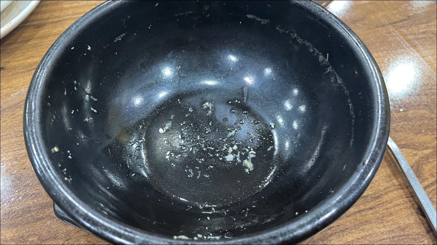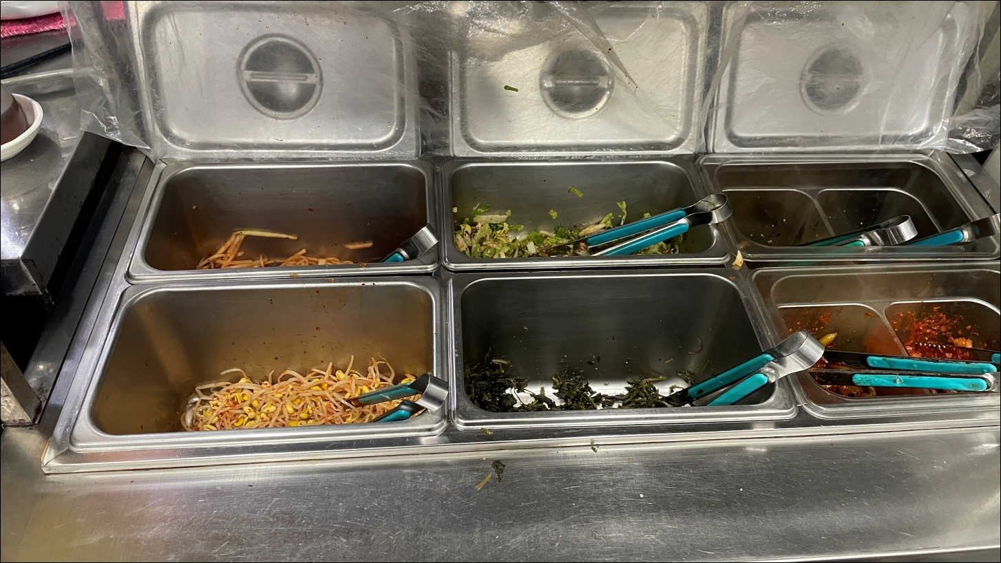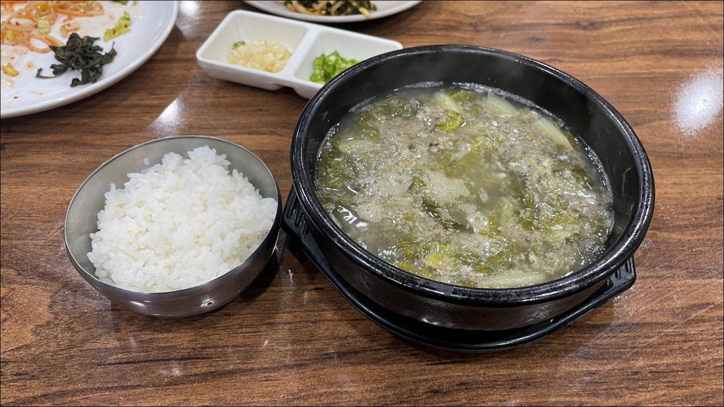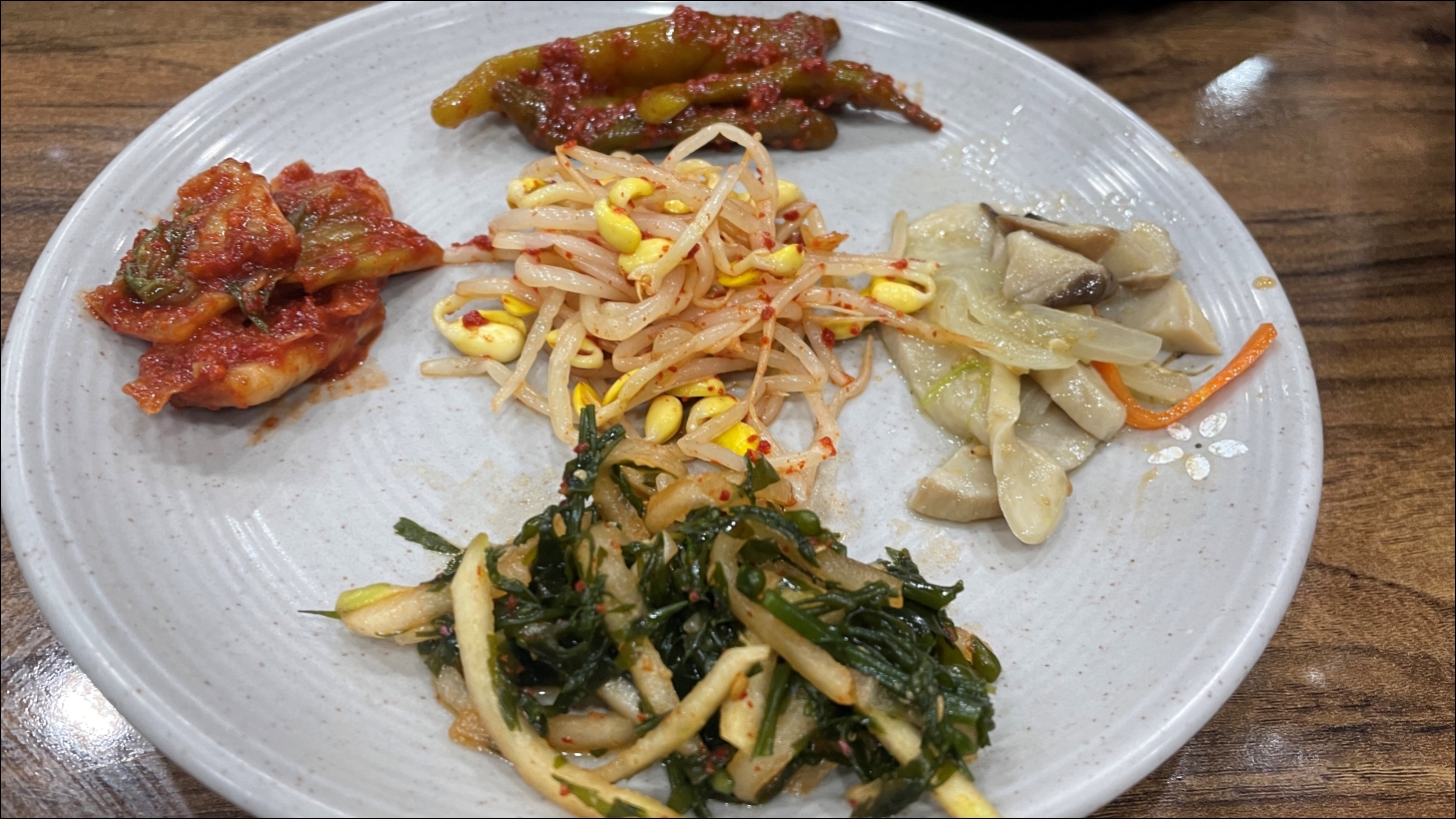 옆 테이블의 아저씨들이 밥을 비벼드시기에, 나도 대접을 하나 가져와서 반찬으로 나온 나물을 넣고 비볐다. (테이블 마다 고추장이 비치되어 있음)