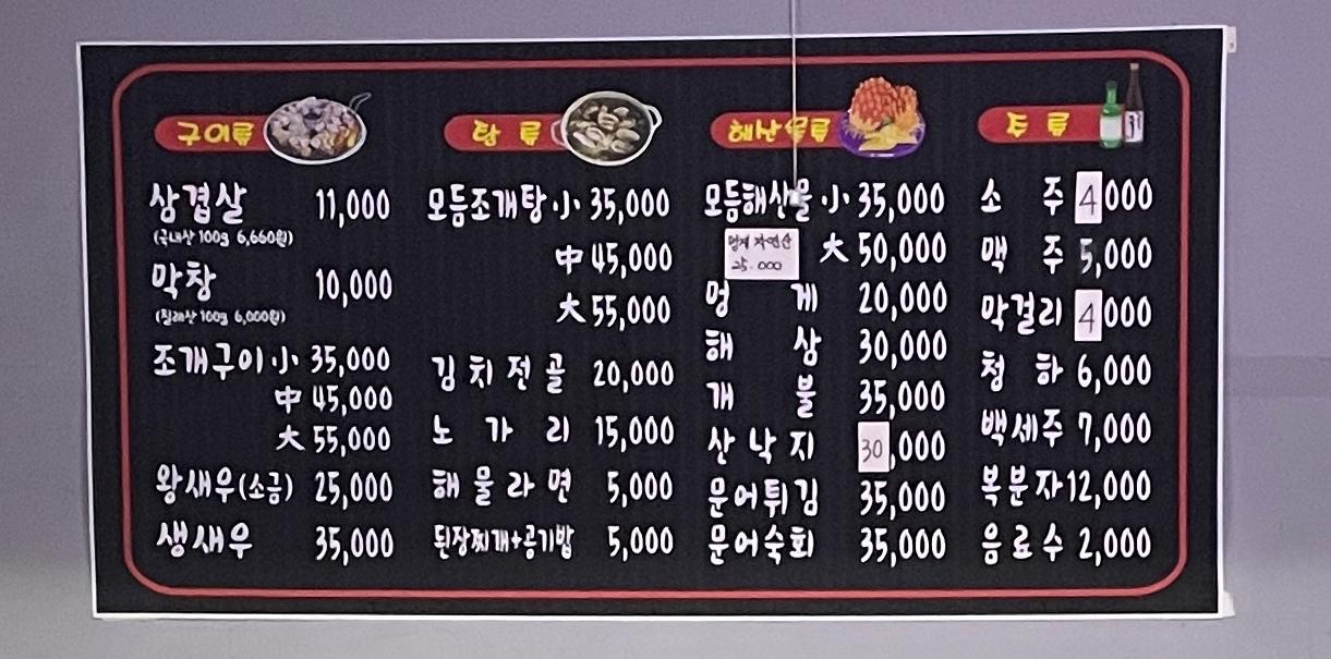 한 번씩 들리는 곳인데 이곳은 조개, 해산물(멍게, 해삼, 개불, 산낙지 등), 삼겹살, 막창 등 모든 것이 한 곳에서 해결되는 멋진 곳입니다. 가격도 괜찮고요.