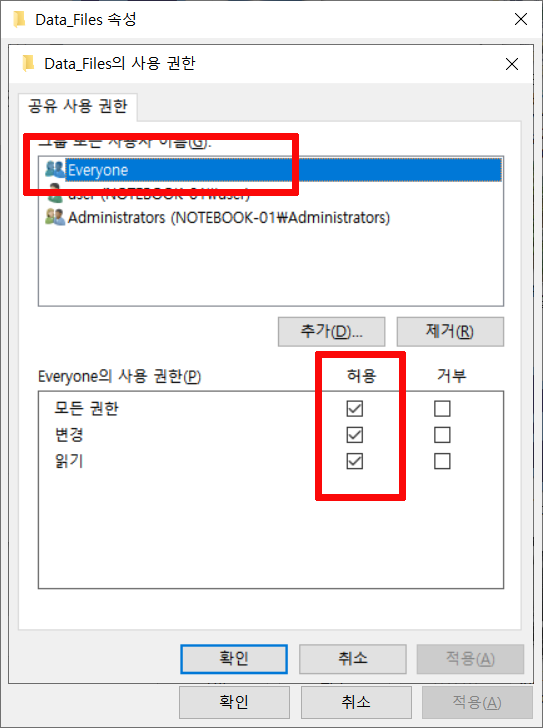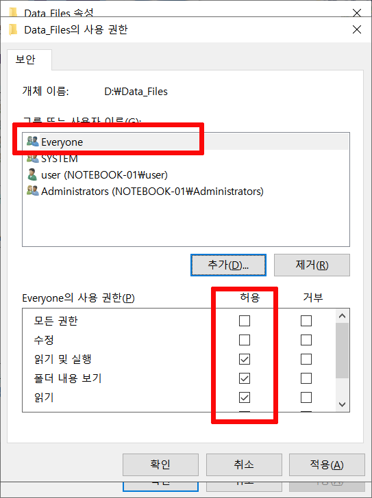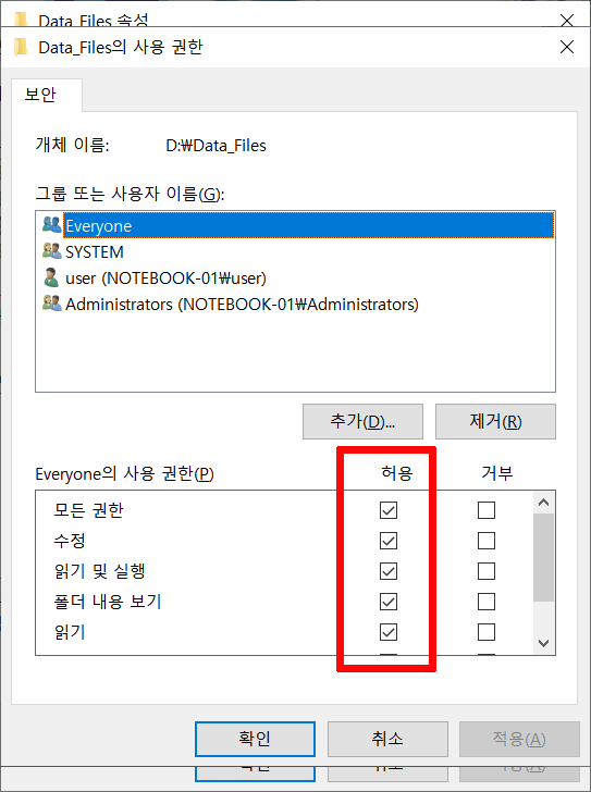 보안탭에 이제 "Everyone"이라고 추가된 것을 볼 수 있고요, Everyone의 사용권한을 모두 허용해줬습니다.