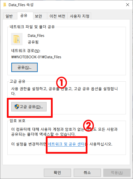 3. 폴더의 속성 중 공유탭에서 고급공유 및 네트워크 및 공유센터 설정