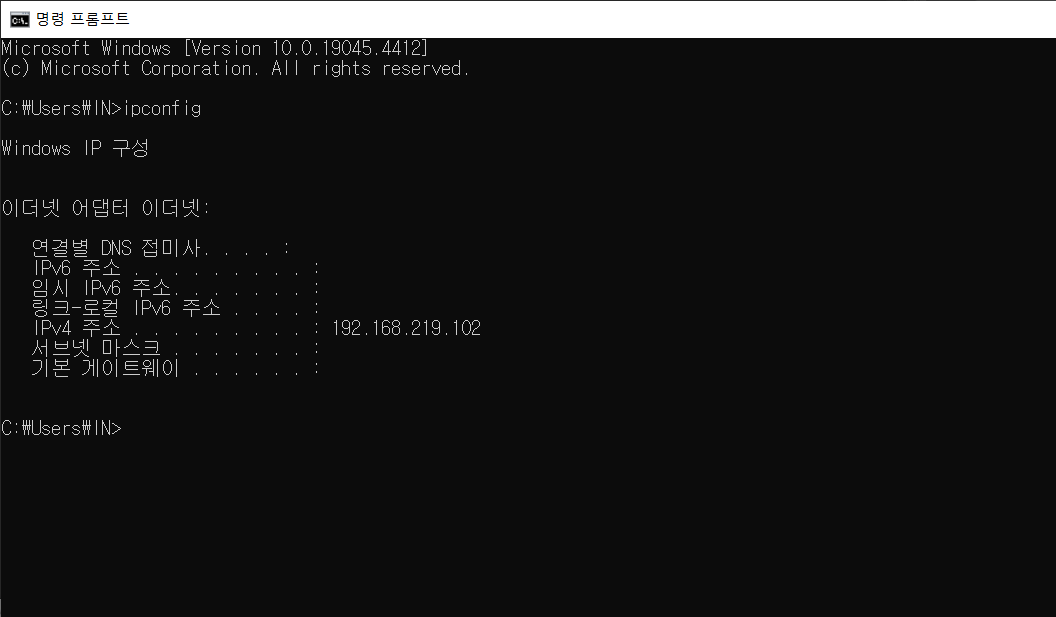 이때 cmd , ipconfig를 이용해서 공유 폴더가 있는 컴퓨터의 IP address를 찾을 수 있습니다.