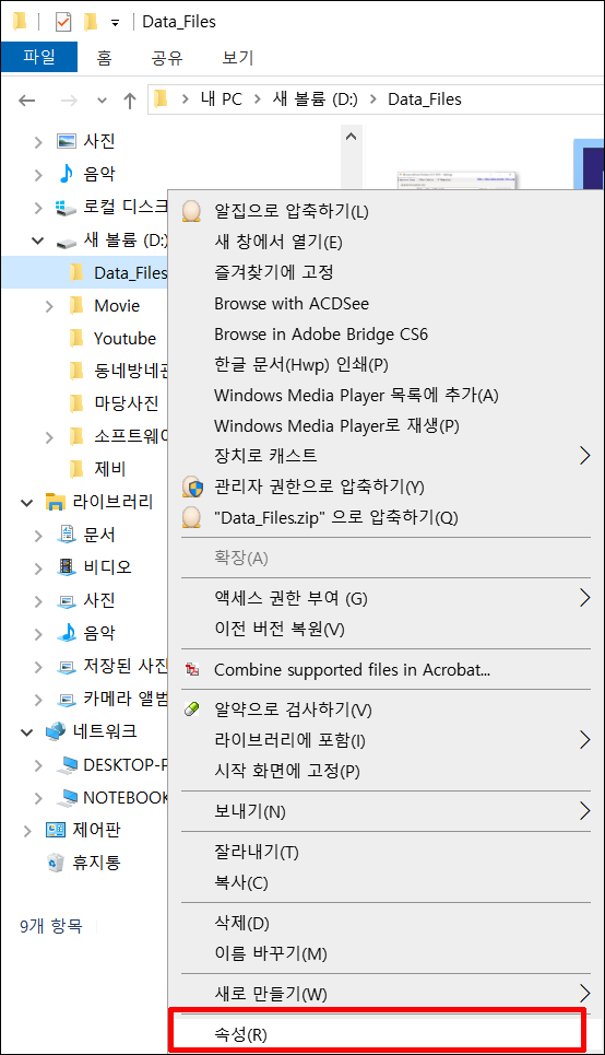 공유할 폴더인 "Data_Files"에서 Right Click 해서 속성을 선택합니다. (이하 내용에서는 빨간색 박스나 글자를 유심히 보시고 따라하시면 됩니다)