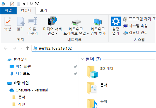 탐색기 상단에 ₩₩192.168.219.102 라고 적고 엔터를 누르시면 드디어 끝납니다. 공유폴더가 보이실 겁니다.