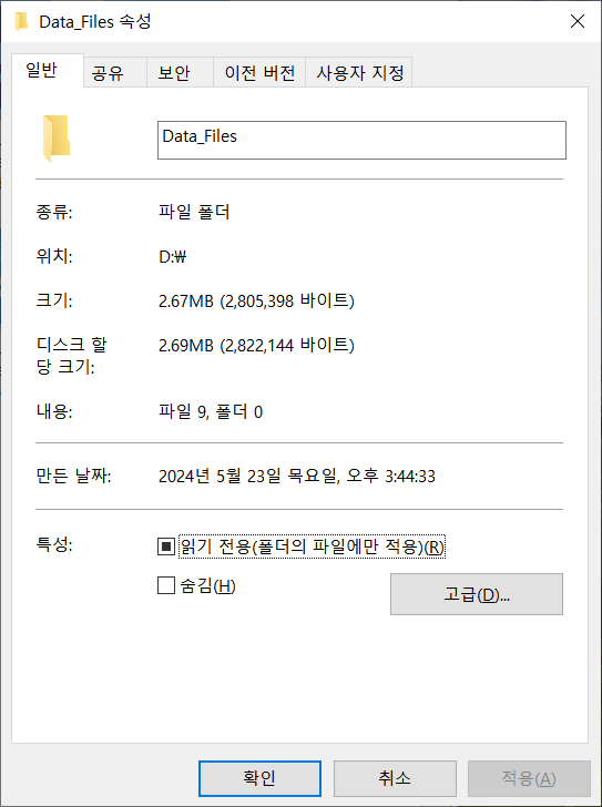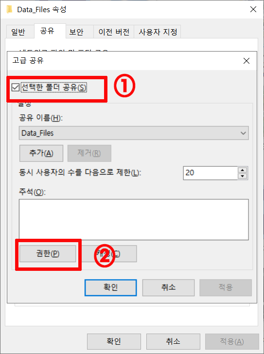 Data_Files 의 속성탭에는 공유, 보안 등이 있는데 네트워크 폴더 공유를 위해서는 보안과 공유에서 공유설정을 하면 됩니다.