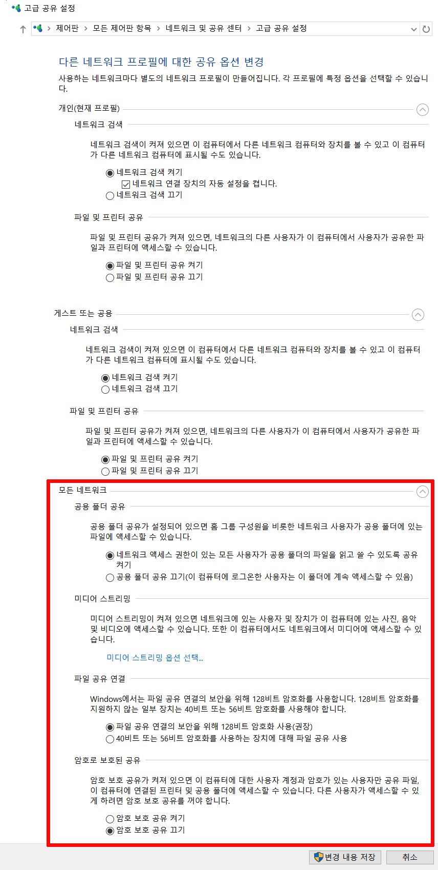 이렇게 세부분이 있는데 쉽게 보여드리기 위해서 하나의 이미지로 만들었습니다. 포인트는 제일 하단에 있는 모든 네트워크에 있습니다. 특히 제일 바닥에 위치한 암호로 보호된 공유 부분입니다. "암호 보호 공유 끄기"를 선택해주셔야 합니다. 끄지 않으면 다른 컴퓨터에서 공유 폴더가 있는 컴퓨터로 접속하는 경우 암호를 묻기때문입니다.