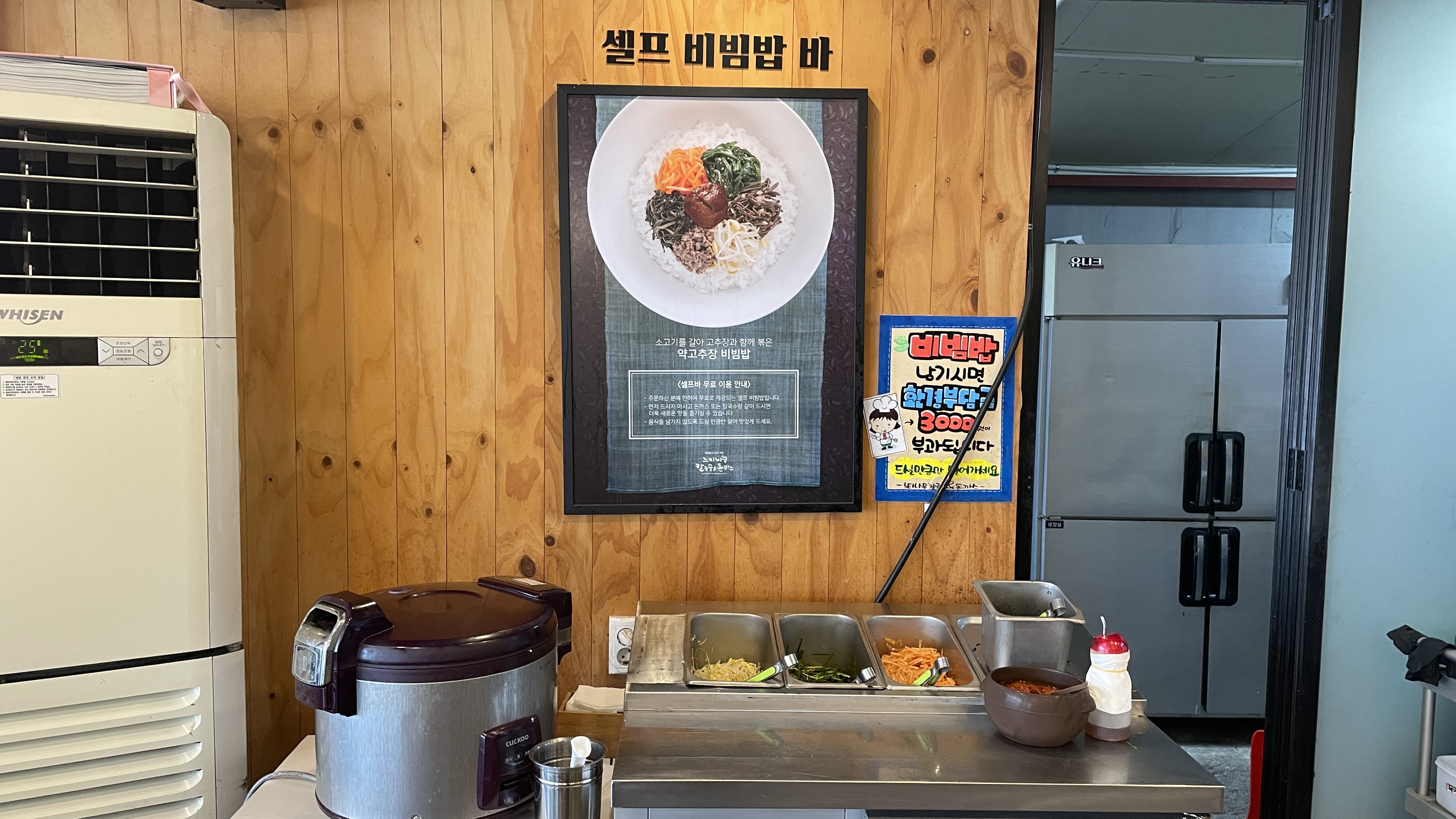 왕돈까스 2개를 주문하고 받은 빈 그릇을 가지고 셀프 비빔밥 코너로 친구가 후다닥 달려갔습니다. 저도 따라갔고요.