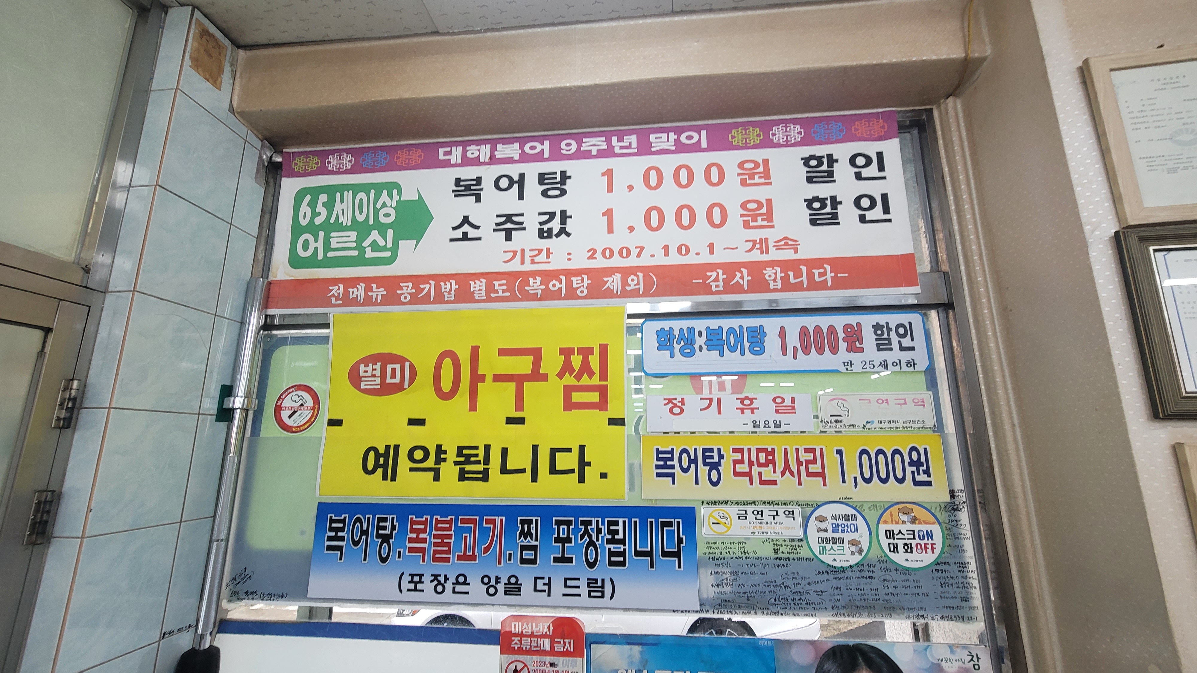 대해복어 이벤트로 65세 이상 어르신이 복어탕이나 소주를 드시면 복어탕과 소주를 각각 1000원 할인했습니다. 학생도 복어탕은 1000원 할인.