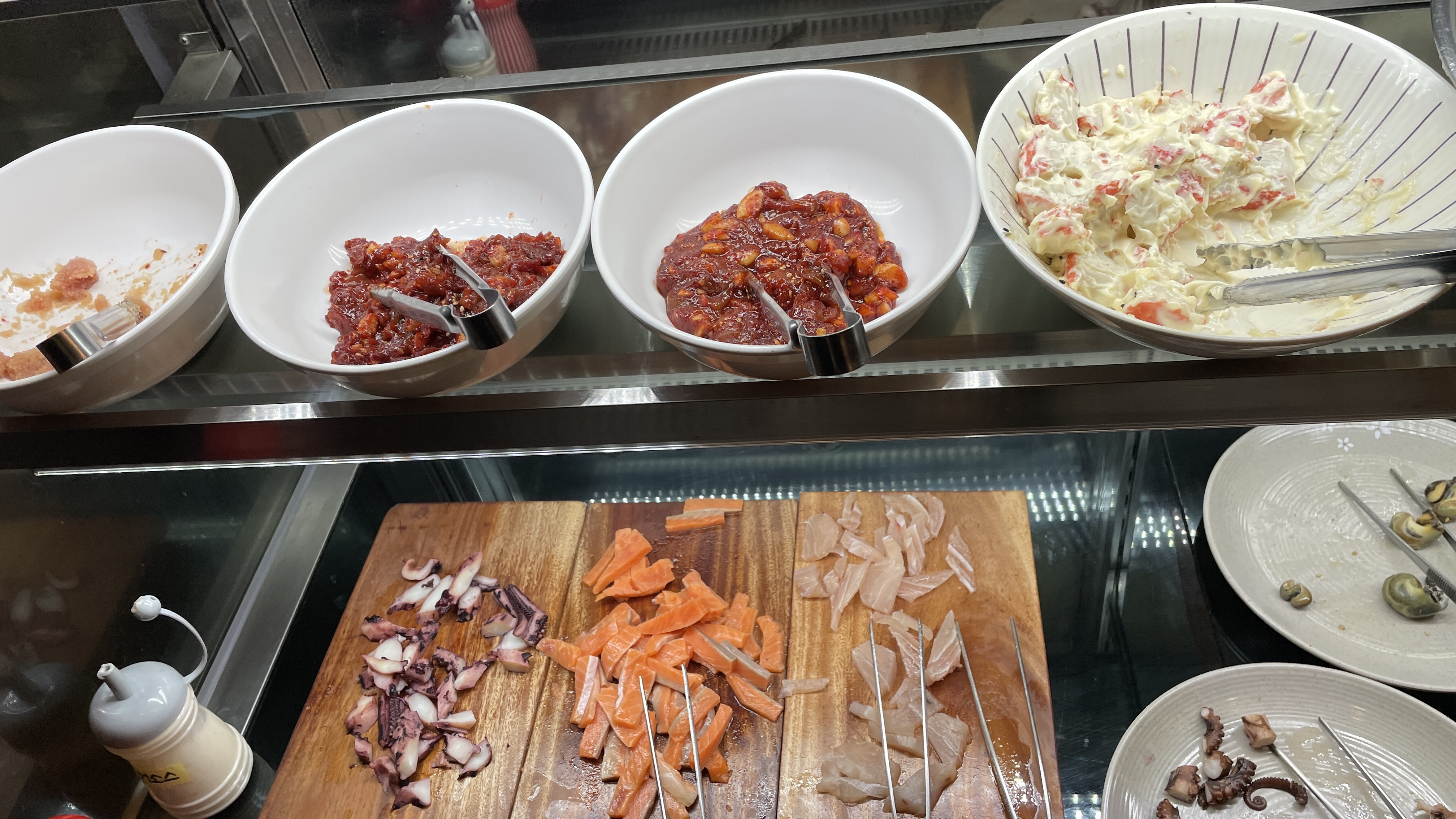 그리고 문어, 연어, 소라, 게장, 젓갈, 샐러드 등 웬만한 호텔뷔페에서 나오는 음식들도 있었습니다.
